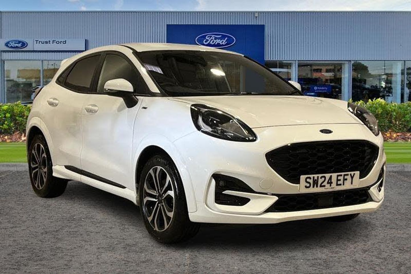Driver impairment monitor, Emergency call service, Ford easy fuel, Full digital 12.3 instrument cluster, Lane keeping aid with lane departure warning, Power assist steering, Power start button, Rear parking sensor, Selectable drive modes(Normal, Eco, Sport, Slippery and Trail), Speed sign recognition, Automatic headlights with auto high beam, Automatic rain sensing wipers, LED rear lamps, Power foldable heated door mirrors with puddle lamps, Projector headlamps with LED day time running lights and front fog lamps, Quickclear heated windscreen, Rear side wing doors, Rear wiper, ST-Line body styling kit with unique grille, Third brake light, 3 seat bench in 2nd row, Centre console with armrest and stowage, Ford megabox extended bootspace, Front and rear head restraints, Front floor mats, Manual 2 way passenger seat adjustment, Manual 4 way driver seat adjust with lumbar adjustment, Single front passenger seat, ST- Line cloth trim with red stitching, ST-Line flat bottomed sensico leather steering wheel with leather handbrake and aluminium gear knob, 3 rear seatbelts, Child safety lock, Electronic stability control (ESC) and hill start assist, Pedestrian/cyclist detection & post-collision braking, Pre collision assist system, Tyre pressure monitoring system (TPMS)