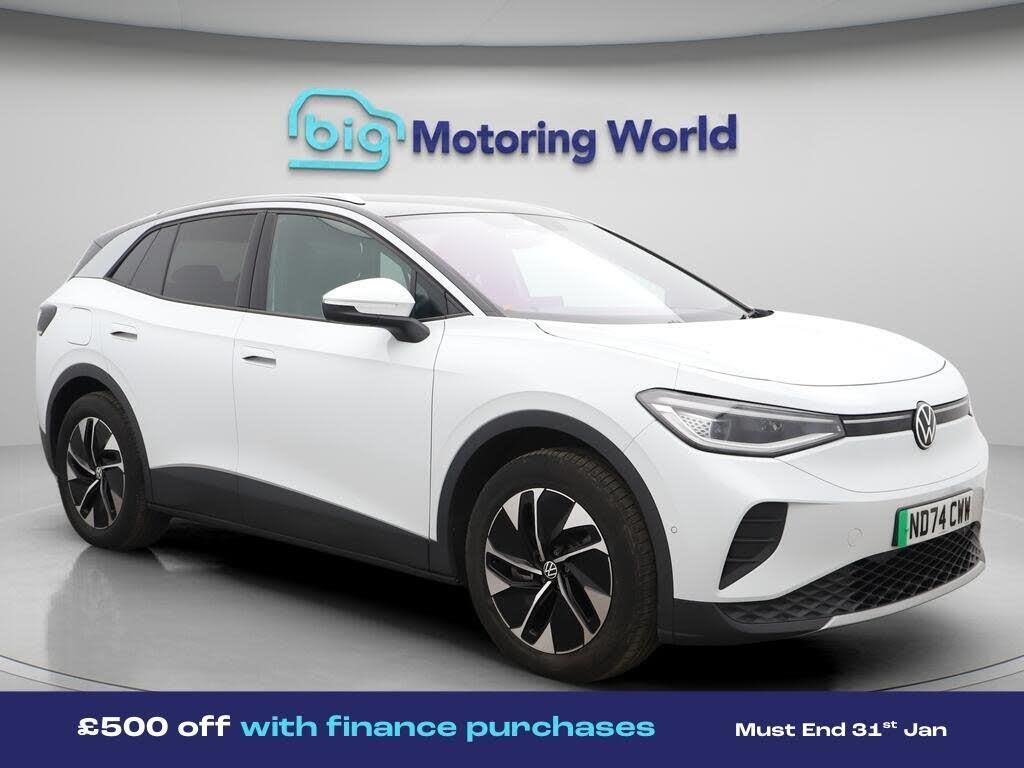 £500 towards your finance depo-Our Volkswagen ID.4 is finished in White. Specification includes a range of fantastic features including £500 towards your finance deposit, All Wheel Drive, Part Leather Seats, Apple CarPlay, Adaptive Cruise Control, Android Auto, Satellite Navigation, Privacy Glass, Heated Seats, Gesture Tailgate Specification information is supplied by CAPHPI and may vary to the actual car. This data does not form any part of a buying contact. Please check specification prior to purchase in-store. The MOT is valid until November 2027, visit bigmotoringworld.co.uk for more photos, a 360 tour, service history and a free HPI report.Were BIG on peace of mind and this White Volkswagen ID.4 has completed our comprehensive 200 point inspection and passed all checks. Its ready for you to drive away with immediate collection in-store. We include a 90-day warranty as standard plus an option to extend for up to 3 years.Reserve this car exclusively for you, safely and securely at bigmotoringworld.co.uk, with a fully refundable £99 deposit. Test drive before you buy, with no commitment, no hassle and a completely haggle free experience. Still searching and want to see thousands more cars? We are BIG on choice with over 8000 cars to choose from.Visit our award winning web site bigmotoringworld.co.uk.Were Big Motoring World and were BIG on what matters to you.