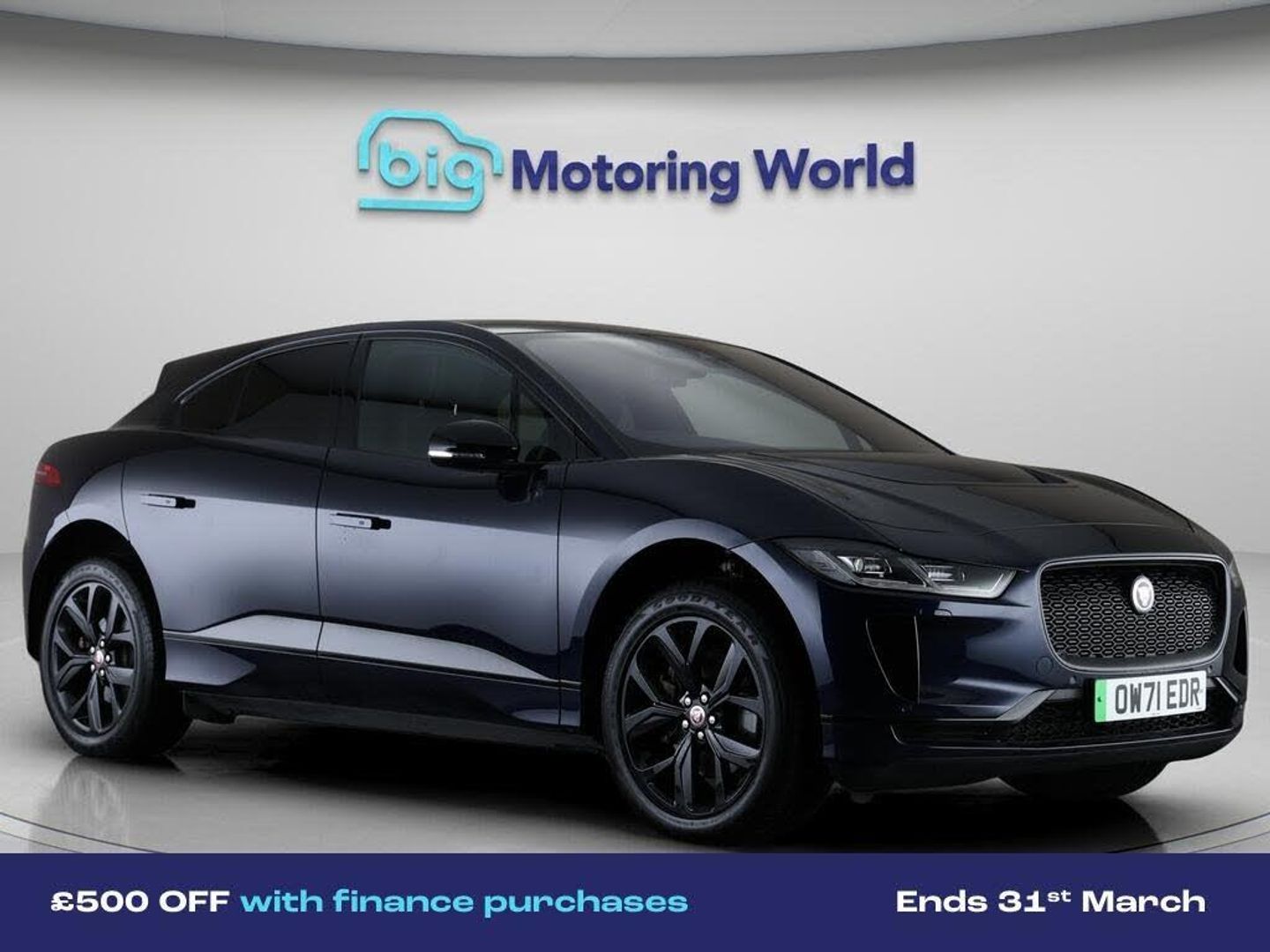 £500 towards your finance depo-Our Jaguar I-PACE is finished in Blue. Specification includes a range of fantastic features including £500 towards your finance deposit, All Wheel Drive, Panoramic Roof, Leather Seats, Apple CarPlay, Adaptive Cruise Control, Meridian Speakers, Android Auto, Satellite Navigation, Privacy Glass Specification information is supplied by CAPHPI and may vary to the actual car. This data does not form any part of a buying contact. Please check specification prior to purchase in-store. The MOT is valid until December 2026, visit bigmotoringworld.co.uk for more photos, a 360 tour, service history and a free HPI report.Were BIG on peace of mind and this Blue Jaguar I-PACE has completed our comprehensive 200 point inspection and passed all checks. Its ready for you to drive away with immediate collection in-store. We include a 90-day warranty as standard plus an option to extend for up to 3 years.Reserve this car exclusively for you, safely and securely at bigmotoringworld.co.uk, with a fully refundable £99 deposit. Test drive before you buy, with no commitment, no hassle and a completely haggle free experience. Still searching and want to see thousands more cars? We are BIG on choice with over 8000 cars to choose from.Visit our award winning web site bigmotoringworld.co.uk.Were Big Motoring World and were BIG on what matters to you.