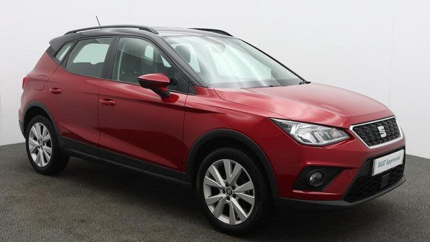 Exterior Features, Black roof, Paint - Metallic, Metallic - Desire red, Trim - Cloth, Cloth - Orgad Blue, Exterior Features, Electric front/rear windows with one touch/auto up/down, Rear window wash/wipe, Windshield wiper with intermittent control and potentiometer, Comfort suspension, Anti theft roof antenna, Black roof rails, Black window surrounds, Body coloured bumpers, Body coloured door handle inserts, Chrome grille surround, Hidden exhaust pipe, Visible VIN plate, Automatic activation of hazard warning lights, Automatic headlights, Electric headlight adjustment, Front fog lights with static cornering function, Halogen headlights, LED daytime running lights, LED licence plate lighting, LED tail lights, Rear fog lights, Safety, ABS+EBA, Electronic stability control, Hill hold control + Tyre Pressure monitor, Multi-Collision braking, Traction control, Cruise control, Electric speed sensitive power steering, Front assistant collision mitigation, Rear parking sensor, Electric adjustable door mirrors, 3 point seatbelts on all rear seats, Child locks on rear doors, Driver/Front Passenger airbags, Front and rear seatbelt reminder, Front side/curtain airbags, Height adjustable active front headrests, Passenger airbag deactivate switch, Tiredness recognition system, Miscellaneous, 'Lights On' Reminder warning buzzer, Digital clock, Full Link Smartphone Integration with Mirror Link, Apple Car Play, Google Android Auto, Low fuel warning light, Outside temperature display, RPM counter, Trip computer, Trim, Interior chrome line trim, 3 rear height adjustable headrests, 60/40 split folding rear seat, Active head restraints, Driver/front passenger seat height adjustment, Isofix attachments on outer rear seats, Audio / Communications, 6 speakers, Bluetooth interface for hands free and audio streaming, DAB Digital radio, SEAT USB media cable, Steering wheel mounted audio controls, Interior Features, Air conditioning, Dust/pollen filter, 2 cupholders, Card holder, Cloth upholstery, Double boot floor, Driver and passenger sunvisors, Gear shift indicator, Height/reach adjustable steering column, Leather handbrake, Leather steering wheel and gear knob, Ambient interior lighting, Footwell ambient lighting, Front courtesy lights, Front reading light, Illuminated boot, Instrument lighting with brightness control, Packs, Connectivity pack plus - Arona, Security, 2 folding remote keys with window open/close function, Immobiliser, Locking wheel bolts, Remote central locking + deadlocks, Wheels, 17 inch Dynamic alloy wheels