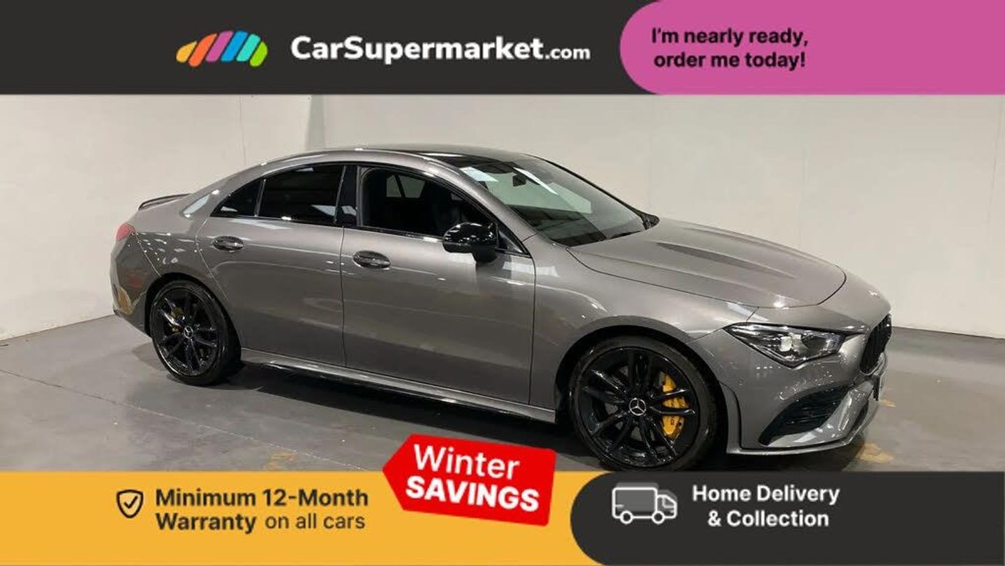 10.25 inch Instrument display with digital cockpit,10.25 inch touchscreen central media display,Active lane keeping assist,Attention assist - Monitors steering behaviour and long journey fatigue,Cruise control with limiter,Digital instrument cluster with three AMG display styles and AMG menu,Direct steer system with speed sensitive power steering,Dual bluetooth interfaces,DYNAMIC SELECT with driving programs (Slippery, Comfort, Sport, Sport+ and Individual),ECO start/stop function,Fluid level warning indicator for fuel, oil, coolant and washer fluid,Hard-disk navigation,Hey Mercedes Voice activation,Lamp failure indicator,MBUX augmented reality for navigation,Mercedes me connect including emergency call system, accident recovery, breakdown and maintenance management,Outside temperature gauge,Owners manual and service booklet in English,Pre-installation for Vehicle Monitoring,Pre-installation for Vehicle Setup,Pre-installation of private car share,Preinstallation for Mercedes Benz link,Radio aerial integrated into front and rear windshields,Service indicator (ASSYST),Smartphone integration with Apple CarPlay and Android auto,Speed limit assist,Trip computer in multifunction display with current consumption indicator,7G-DCT 7 speed automatic transmission,AMG suspension,Rear axle multi-link,DAB digital radio tuner,MBUX multimedia system with DAB digital radio and touchpad including satellite navigation,Mercedes Benz advanced sound system (225 W) with 10 speakers, 1 central speaker, speakers on doors, a tweeter on door,one sub woofer + boost amplifier,USB (type C) ports (2) in stowage compartment and 1 in front of centre console,Adaptive brake lights,AMG body styling with AMG front apron and rear apron and visible exhaust tailpipe in chrome trim elements,AMG bodystyling side skirts,AMG Front apron with flics as air deflector elements on the outer air intakes,AMG radiator grille with twin blade lamella and AMG Lettering,AMG Rear apron with specific diffuser look with four vertical fins and two round chrome plated tailpipe trim elements with a diameter of 90 mm,AMG Sports exhaust system with two round tailpipes measuring 90 mm in diameter attached in rear apron, AMG lettering plus ribbing on the inside of the,Beltline strips in High gloss Black,Body colour bumpers,Body colour door handles,Chrome weather strip,Electric windows,Electrically adjustable and heated door mirrors with integrated LED indicators,Front wings with TURBO 4MATIC lettering,Headlamp assist automatic headlamp activation,Heated glass rear windscreen + timer control,High level LED third brake light,LED high performance headlamps with integrated LED daytime running lights,LED tail lamp,Privacy glass with dark tinting on rear side windows and rear window,Rain sensing windscreen wipers with two sensitivity settings,Rear fog lamp,Vehicle Monitoring,Vehicle Setup,Window line trim strip in high gloss black,40:20:40 split folding rear seat backrests,Air conditioning - Two zone thermotronic luxury automatic climate control with display,Air vents with surround in silver chrome,AMG Performance steering wheel in nappa leather,Automatic child seat recognition sensor,Black roof lining,Brushed stainless steel sports pedals with rubber studs,Front centre armrest with stowage,Front seat cushion length adjustment,Heated front seats,Illuminated glove compartment stowage,Illuminated Mercedes benz door sills with Mercedes Benz lettering,Interior lighting - 64 colour Ambient lighting,Luggage net on driver/front passenger seat backrest,Manually adjustable front seats,Manually height and reach adjustable steering column,Rear armrest with two integral cup holders for drinks,Rear head restraints,Rear interior lamp,Silver coloured aluminium gear shift paddles on steering wheel,Spectacles compartment for driver,Sport seats with fixed head restraints,Stowage compartment in centre console with retractable cover,Sunvisors with illuminated vanity mirrors,Touchpad on center console,Twin front cupholders,Two outer rear seat isofix and top tether child seat fixing points,AMG Night package - CLA 35/45,Keyless go pack - CLA,Light and sight pack - CLA,Mirror pack - CLA,Parking package - CLA,Seat comfort pack - CLA,Active bonnet pedestrain safety measure which detects an impact and raises bonnet by 65mm,Active brake assist includes forward collision warning system with autonomous braking,Adaptive brake assist with hold function and hill start assist,Anti-lock braking system (ABS),Black seat belts,Bonnet with power domes,Brake pad wear warning indicator,Childproof locks manually operated for rear doors and electrically operated for rear power windows,Crash responsive emergency lighting,Driver and front passenger head and sidebags,Driver and front passenger windowbags,Drivers knee airbag,Dual stage driver and front passenger airbags,Electric parking brake,Electronic stability programme with acceleration skid control,ESP curve dynamic assist,Front and rear seatbelt reminder