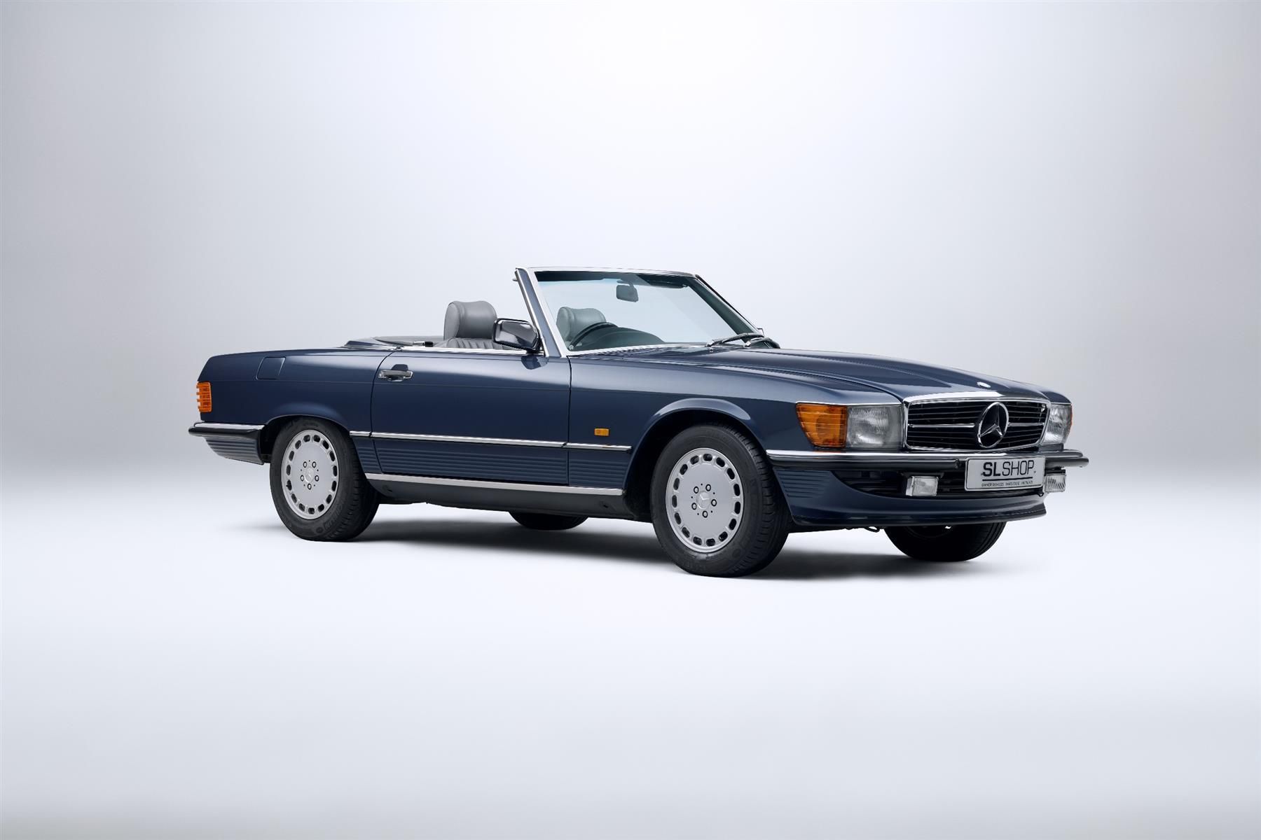 Collected from Puttocks Ltd, Mercedes-Benz in Guildford, Surrey, in August 1986 by A Fielding, this R107 300 SL has lived a pampered life, having covered only 22,700 miles since. Finished in Nautical Blue Metallic over a Grey Leather interior, the fabric folding roof is a beautiful contrasting dark blue, with the car also retaining its hard top and stand. Well known to us a SLSHOP, this 300SL has been touched with celebrity, having been bought by English footballer Peter Crouch as a 30th birthday gift for his wife Abbey Clancy. Since then, it's changed hands to its present owner, who has, like its previous custodians, used it sparingly and lovingly looked after it to retain it in its superb condition. That lack of use is why it's being moved on, with the present owner keen that someone else gets to enjoy this wonderful example. Its charmed life is very obvious when viewing this car, as it is in very good overall condition. Nautical Blue Metallic suits the R107, with its paintwork in excellent condition, the chrome all bright and straight and the wheels free from and parking nicks, with the interior similarly neat and tidy - this car benefitting from the optional fitment of rear seats. The hood is in fantastic condition, and mechanically this 300 SL feels much the same as it would have when it was driven from the dealership in 1986. There's a stamped-up service book to verify the mileage, with hand-written notes from its current owner also highlighting its occasional use. Plenty of other documentation, including numerous MOTs verify that low mileage, while there's ample evidence of regular servicing with numerous invoices outlining its maintenance over the years. An original brochure is in there, along with all the Mercedes-Benz booklets, owner's manual and even a print-out of a newspaper article describing Peter Crouch's generous gift back in 2016, and a note of his ownership, too, on an old V5. A low mileage 300SL in very good condition throughout and finished in a desirable colour combination would be appealing enough but adding in some celebrity sparkle only increases its appeal and creates even more of a talking point for the next owner of this car. A car that's begging to have some more miles added onto its odometer this coming summer, and ready to be enjoyed.