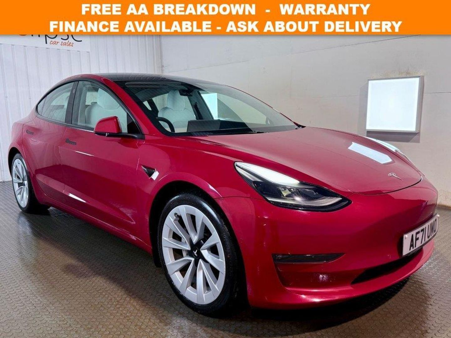**THIS VEHICLE MAY BE AT OUR 150-CAR STORAGE FACILITY. PLEASE CALL AHEAD TO ARRANGE VIEWING AT OUR WINCHESTER SALES SITE** Tesla Model 3 Dual Motor long range Saloon first registered September 2021 (71 reg). Finished in Red Multi-Coat with a white leather interior and 19 inch Turbine Performance wheels. Spec includes heated front and rear seats | AutoPilot with Autosteer Beta | Google Maps Navigation | Reversing camera | Heated steering wheel | Powered Tailgate | Tinted Panoramic Roof | Front and Rear parking sensors. Eclipse Car Sales are Proud to be an approved AA dealership. Every car includes 12 Months AA Breakdown Cover, 3 Months National Warranty Included, Upgrade packages available, Part exchange welcome, Debit cards accepted, a range of affordable finance packages available to fit all circumstances, Open 7 days a week, 9am - 5.30pm Monday to Saturday & 10am - 3pm Sundays & Bank Holidays, Contact us on 0238 2028811 or email sales@eclipsecarsales.co.uk . Red,19in Alloy Wheels - Silver Sports,12-Way Power Adjustable Front and Rear Heated Seats,15in Touchscreen with Onboard Maps and Navigation,18in Alloy Wheels - Aero,2 Zone Climate Control,3x3 Point Rear Seat Belts,60-40 Split Folding Rear Seats,ABS - Anti-lock Braking System,Adaptive Cruise Control,Adaptive Steering,Additional USB-A Port - Glove Compartment,Air Conditioning,Airbags - Curtain,Airbags - Driver,Airbags - Passenger,Airbags - Side,Ambient - Interior Lighting,Audio Remote Control,Auto Dimming - Power Folding - Heated Side Mirrors,Automated High-Beam Assist,Automatic Emergency Braking,Autopilot Function,Blind Spot Information,Bluetooth Connection,Body Coloured Bumpers,Centre Console with Storage - 4 USB Ports and Docking for 2 Smartphones,Collision Avoidance,Custom Driver Profiles,Height Adjustable Drivers Seat,Daytime Running Lights - LED,Digital Radio,DVD,Electric Hinged Side Doors - Front,Electric Hinged Side Doors - Rear,Electrically Adjustable Drivers Seat,Electrically Adjustable Passenger Seat