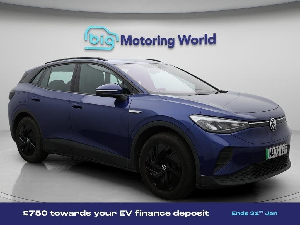 £750 towards your finance depo-Our Volkswagen ID.4 comes with optional extras worth £685. Specification includes a range of fantastic features including £750 towards your finance deposit, Comfort Pack, Part Leather Seats, Apple CarPlay, Adaptive Cruise Control, Android Auto, Satellite Navigation, Heated Seats, Rear View Camera, Heated Steering Wheel Specification information is supplied by CAPHPI and may vary to the actual car. This data does not form any part of a buying contact. Please check specification prior to purchase in-store. The MOT is valid until September 2026, visit bigmotoringworld.co.uk for more photos, a 360 tour, service history and a free HPI report.Were BIG on peace of mind and this Blue Volkswagen ID.4 has completed our comprehensive 200 point inspection and passed all checks. Its ready for you to drive away with immediate collection in-store. We include a 90-day warranty as standard plus an option to extend for up to 3 years.Reserve this car exclusively for you, safely and securely at bigmotoringworld.co.uk, with a fully refundable £99 deposit. Test drive before you buy, with no commitment, no hassle and a completely haggle free experience. Still searching and want to see thousands more cars? We are BIG on choice with over 8000 cars to choose from.Visit our award winning web site bigmotoringworld.co.uk.Were Big Motoring World and were BIG on what matters to you.