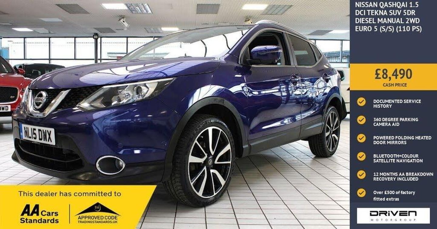 NISSAN QASHQAI 1.5 DCI TEKNA SUV 5DR DIESEL FINISHED IN INK BLUE AND COMPLIMENTED WITH BLACK LEATHER INTERIOR, THIS VEHICLE HAS BEEN VERY WELL CARED FOR AND MAINTAINED WITH DOCUMENTED SERVICE HISTORY CARRIED OUT AT 4556, 9524, 14195, 19895, 25913, 28921, 33737, 38724, 42973, 46959 MILES PLUS COMPREHENSIVE PRE DELIVERY HEALTH CHECK COMPLETED PRIOR TO SALE AT 51193 MILES. KEY FEATURES INCLUDE ALLOY WHEELS, ALARM, AUTO DIMMING REAR VIEW MIRROR, AUTOMATIC LIGHTS, 360 DEGREE CAMERA, AUTOMATIC WIPERS, AUX SOCKET, DUALZONE CLIMATE CONTROL, CRUISE CONTROL WITH SPEED LIMITER, DAB RADIO, POWER FOLDING HEATED DOOR MIRRORS, HEATED WINDSCREEN, IMMOBILISER, INTELLIGENT PARK ASSIST, FRONT AND REAR PARKING SENSORS, AMBIENT LIGHTING, LANE ASSIST, RADIO/CD PLAYER, NISSAN CONNECT SATALLITE NAVIGATION, STEERING WHEEL AUDIO CONTROLS, BLUETOOTH INTEGRATION, TOUCHSCREEN, USB PORT PLUS MUCH MORE. COMMITTED TO AA CARS STANDARDS: 3 MONTHS OR 3000 MILES WARRANTY INCLUDED WITH AN OPTION TO UPGRADE: 12 MONTHS AA BREAKDOWN RECOVERY INCLUDED: £75.00 CONTRIBUTION TOWARDS YOUR NEXT SERVICE/MOT AT ANY AA CARS STANDARD APPROVED WORKSHOP: WE STAND BY THE QUALITY OF OUR VEHICLES. WITH THE PURCHASE OF THIS VEHICLE, YOU WILL RECEIVE 3 MONTHS OR 3000 WARRANTY, 12 MONTHS AA BREAKDOWN RECOVERY, GIVING YOU ADDITIONAL PEACE OF MIND AND PROTECTION. ALL OUR CARS COME WITH AT LEAST 6 MONTHS MOT AND PRE SALE HEALTH CHECK AND ROAD TEST. OUR PROFESSIONAL TEAM ENSURES YOUR VEHICLE STAYS IN TOP CONDITION, AND YOU ENJOY A HASSLE-FREE OWNERSHIP EXPERIENCE. 4.7 STARS ON GOOGLE WITH OVER 550 REVIEWS: JOIN OUR COMMUNITY OF SATISFIED CUSTOMERS! OUR DEALERSHIP IS PROUD TO HAVE A 4.7 STAR RATING ON GOOGLE, BACKED BY OVER 550 POSITIVE REVIEWS. WE ARE COMMITTED TO PROVIDING EXCELLENT SERVICE AND HIGH-QUALITY VEHICLES. This Vehicle Comes Equipped with High Specification, Which Includes: - Drive this car home with complete confidence and satisfaction: All cars proudly offered by driven group are rigorously inspected, hpi checked and prepared to the highest standard To drive this car home, visit www.drivegroup.co.uk or call 01642-601999 to arrange an appointment with our sales team Please note we do not operate an organised distance selling scheme as defined by the consumer contracts (cancellation, information and additional charges) regulations 2013. Therefore, even if you choose to not view your vehicle at our premises prior to purchase,you will not be entitled to cancel your order under any 14 day cancellation period. All other statutory rights remain unaffected. Whilst every effort has been made to ensure the accuracy of the information contained in this website, please check with us about any item which may affect your decision to purchase. Driven motor group shall not be liable for any errors, inaccuracies or delays in content.