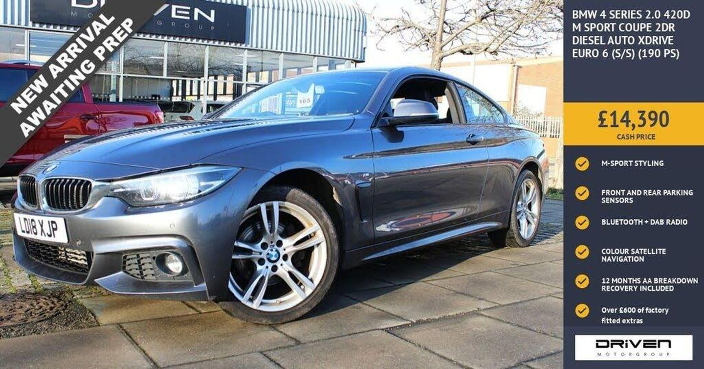 BMW 4 SERIES 2.0 420D M SPORT COUPE 2DR DIESEL AUTO XDRIVE FINISHED IN MINERAL GREY AND COMPLIMENTED WITH DAKOTA BLACK LEATHER INTERIOR, THIS VEHICLE HAS BEEN VERY WELL CARED FOR AND MAINTAINED WITH DOCUMENTED SERVICE HISTORY CARRIED OUT AT 23671, 41596, 58418, 64273 MILES PLUS COMPREHENSIVE PRE DELIVERY HEALTH CHECK AND SERVICE COMPLETED PRIOR TO SALE AT 76483 MILES. KEY FEATURES INCLUDE ALLOY WHEELS, DUALZONE CLIMATE CONTROL, ALARM, AMBIENT LIGHTING, BLUETOOTH, CD PLAYER, BMW TELESERVICES, CRUISE CONTROL WITH BRAKE FUNCTION, DAB RADIO, LED HEADLIGHTS, M-SPORT STYLING, BMW PROFESSIONAL SERVICES, AUTOMATIC HEALDIGHTS, FRONT SPORT SEATS, HEATED WASHER JETS, FRONT AND REAR PARKING SENSORS, MULTIMEDIA SYSTEM PLUS MUCH MORE. COMMITTED TO AA CARS STANDARDS: 3 MONTHS OR 3000 MILES WARRANTY INCLUDED WITH AN OPTION TO UPGRADE: 12 MONTHS AA BREAKDOWN RECOVERY INCLUDED: £75.00 CONTRIBUTION TOWARDS YOUR NEXT SERVICE/MOT AT ANY AA CARS STANDARD APPROVED WORKSHOP: WE STAND BY THE QUALITY OF OUR VEHICLES. WITH THE PURCHASE OF THIS VEHICLE, YOU WILL RECEIVE 3 MONTHS OR 3000 WARRANTY, 12 MONTHS AA BREAKDOWN RECOVERY, GIVING YOU ADDITIONAL PEACE OF MIND AND PROTECTION. ALL OUR CARS COME WITH AT LEAST 6 MONTHS MOT AND PRE SALE HEALTH CHECK AND ROAD TEST. OUR PROFESSIONAL TEAM ENSURES YOUR VEHICLE STAYS IN TOP CONDITION, AND YOU ENJOY A HASSLE-FREE OWNERSHIP EXPERIENCE. 4.8 STARS ON GOOGLE WITH OVER 550 REVIEWS: JOIN OUR COMMUNITY OF SATISFIED CUSTOMERS! OUR DEALERSHIP IS PROUD TO HAVE A 4.8 STAR RATING ON GOOGLE, BACKED BY OVER 550 POSITIVE REVIEWS. WE ARE COMMITTED TO PROVIDING EXCELLENT SERVICE AND HIGH-QUALITY VEHICLES. This Vehicle Comes Equipped with High Specification, Which Includes: - Drive this car home with complete confidence and satisfaction: All cars proudly offered by driven group are rigorously inspected, hpi checked and prepared to the highest standard To drive this car home, visit www.drivegroup.co.uk or call 01642-601999 to arrange an appointment with our sales team Please note we do not operate an organised distance selling scheme as defined by the consumer contracts (cancellation, information and additional charges) regulations 2013. Therefore, even if you choose to not view your vehicle at our premises prior to purchase,you will not be entitled to cancel your order under any 14 day cancellation period. All other statutory rights remain unaffected. Whilst every effort has been made to ensure the accuracy of the information contained in this website, please check with us about any item which may affect your decision to purchase. Driven motor group shall not be liable for any errors, inaccuracies or delays in content.