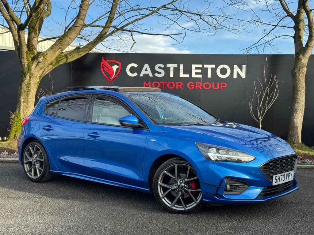 HPI CLEAR , 2 X KEYS , GENUINE LOW MILEAGE , FULL SERVICE HISTORY RECORD AND IN EXCELLENT CONDITION THROUGHOUT - 2020 FORD FOCUS 1.0 TURBO AUTOMATIC ''ST-LINE X'' FINISHED IN PEARLESCENT BLUE PAINTWORK OVER AND HEATED PART LEATHER SPORTS INTERIOR - MASSIVE SPECIFICATION MODEL WITH FULLY OPENING PANORAMIC GLASS SUNROOF , VIRTUAL COCKPIT ''DIGITAL DASH'' , FULL ST BODY STYLING PACK , LED XENON HEADLIGHTS , PRIVACY GLASS TO REAR , 360o OPTICAL PARKING SYSTEM , MULTI SPOKE ALLOY WHEELS FINISHED IN ''GUNMETAL'' GREY ALONG WITH RED BRAKE CALIPERS , AUTO LIGHTS & RAIN SENSING WIPERS , AUTOMATIC GEARBOX WITH TIPTRONIC FUNCTION & STEERING WHEEL PADDLE SHIFTS - CRUISE CONTROL , TRACTION CONTROL , LANE ASSIST AND STOP / START TECHNOLOGY , HEATED LEATHER TRIMMED FLAT BOTTOM MULTIFUNCTION STEERING WHEEL , FULLY KEYLESS ENTRY AND START SYSTEM , 4 X ELECTRIC WINDOWS WITH GLOBAL FACILITY , ''WINTER PACK'' WITH HEATED POWER FOLDING WING MIRRORS , HEATED STEERING WHEEL , HEATED SEATS PLUS HEATED FRONT & REAR SCREENS , DUAL ZONE DIGITAL CLIMATE CONTROL WITH AIR CONDITIONING , PREMIUM INFOTAINMENT CENTRE WITH XL COLOUR TOUCHSCREEN AND WIRELESS CHARGING - SATELLITE NAVIGATION , BLUETOOTH TELEPHONE , DAB DIGITAL RADIO AND ALL SMARTPHONE HOOKUPS WITH BLUETOOTH AUDIO STREAMING , APPLE CARPLAY AND ANDROID AUTO PLUS A BEAUTIFUL BLACK PART LEATHER SPORTS INTERIOR COMPLIMENTED BY RED DOUBLE STITCHING AND COMPLETE WITH 10-WAY ELECTRONIC SEAT ADJUSTMENT AND 3-STAGE HEATING - EXCELLENT PERFORMANCE & FUEL ECONOMY , A VERY LOW INSURANCE GROUP & ROAD TAX BRACKET PLUS ''EURO 6'' STATUS SO EXEMPT FROM ALL EMISSION CONTROLLED ZONES NATIONWIDE - SUPPLIED WITH A FULL ENGINE SERVICE AND PRE-DELIVERY INSPECTION , 12 MONTHS MOT WITH ANY ADVISORIES CORRECTED AND 6 MONTHS ''PLATINUM LEVEL'' NATIONWIDE WARRANTY-PANROOF|''ST'' STYLING|AUTOMATIC-DEBIT CARDS ACCEPTED, FINANCE & PART EX, HPI/VOSA VERIFIED, 100 POUND DEPOSIT TO SECURE ANY VEHICLE