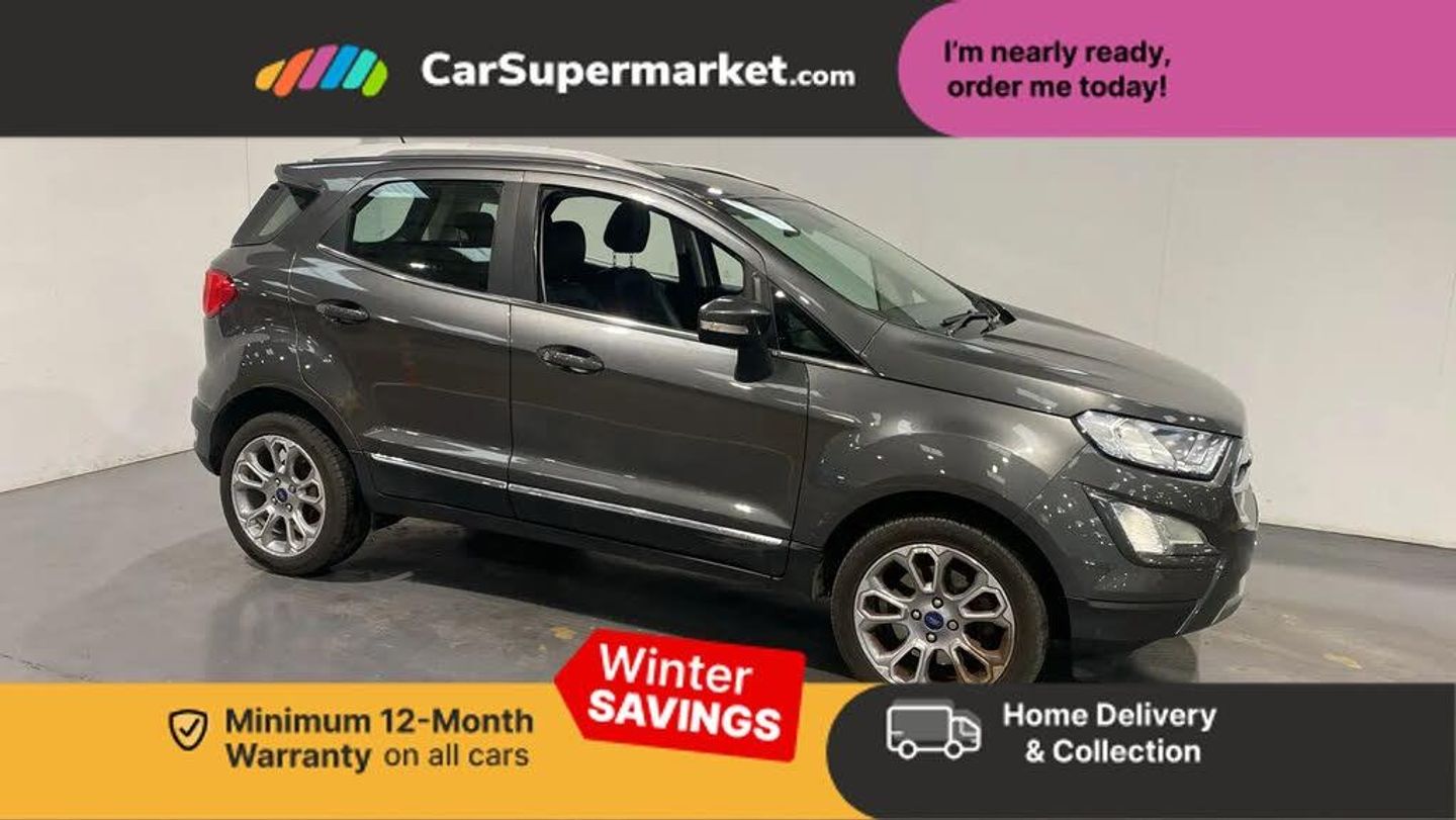 Cruise control,Easy fuel capless refuelling system,PAS,SYNC 3 nav system with DAB radio, 8" screen, voice control, emergency assistance, Apple car play/Android auto, 2x USB, Ford pass connect,Trip computer,'Quickclear' heated windscreen/heated washer jets,Auto dimming rear view mirror,Automatic headlights,Body colour door handles,Body coloured bumpers,Electrically adjustable and heated door mirrors,Front door threshold plates,Front fog lights,Front grille with chrome trim surround,Headlamps with LED day running lights,Headlight levelling control,Power foldable door mirrors with puddle lights,Power front and rear windows with global opening/closing,Rain sensing front wipers,Rear wiper,12V socket in front and rear,60/40 split rear seats,7 shade adjustable ambient lighting,Ambient light,Centre console with sliding front armrest,Cooled glovebox,Courtesy lights with map reading light,Driver seat height/lumbar adjust,Driver's side glovebox,Driver/passenger sunvisors and lidded vanity mirrors,EATC - Electronic Auto Temperature control,Folding grab handles,Footwell ambient lighting,Front head restraints,Front seat back map pockets,Groove cloth/leather upholstery,Illuminated glovebox,Illuminated luggage compartment,Isofix system on outer rear seats,Leather gear knob and handbrake grip,Leather steering wheel with audio controls,Luggage compartment carpet,Overhead console with sunglasses holder,Rake adjustable rear seats,Reach + rake adjustable steering column,Rear headrests,Steering wheel with chrome inserts,Storage drawers under front seats,Tie down hooks,Variable boot floor,Rear view camera pack - Ecosport,3x3 point rear seatbelts,ABS,Child locks on rear doors,Curtain airbags,Driver airbag,Drivers knee airbag,Electronic Stability Programme with hill launch assist,Emergency brake assist,Front passenger airbag deactivation,Front side airbags,Passenger airbag,Seatbelt reminder for driver and front passenger,Traction control,Tyre pressure monitoring system,Immobiliser,MyKey system,Remote central locking,Thatcham 1 volume sensing alarm,Tyre inflation kit