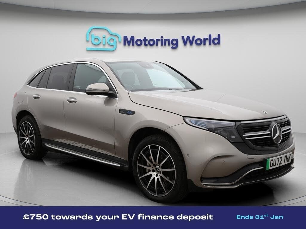 £750 towards your finance depo-Our Mercedes-Benz EQC comes with optional extras worth £715. Specification includes a range of fantastic features including £750 towards your finance deposit, Comfort Pack, All Wheel Drive, 20'' Alloy Wheels, Leather Seats, Air Suspension, Apple CarPlay, Lane Assist, AMG body styling, Parking Pack Specification information is supplied by CAPHPI and may vary to the actual car. This data does not form any part of a buying contact. Please check specification prior to purchase in-store. The MOT is valid until September 2026, visit bigmotoringworld.co.uk for more photos, a 360 tour, service history and a free HPI report.Were BIG on peace of mind and this Silver Mercedes-Benz EQC has completed our comprehensive 200 point inspection and passed all checks. Its ready for you to drive away with immediate collection in-store. We include a 90-day warranty as standard plus an option to extend for up to 3 years.Reserve this car exclusively for you, safely and securely at bigmotoringworld.co.uk, with a fully refundable £99 deposit. Test drive before you buy, with no commitment, no hassle and a completely haggle free experience. Still searching and want to see thousands more cars? We are BIG on choice with over 8000 cars to choose from.Visit our award winning web site bigmotoringworld.co.uk.Were Big Motoring World and were BIG on what matters to you.