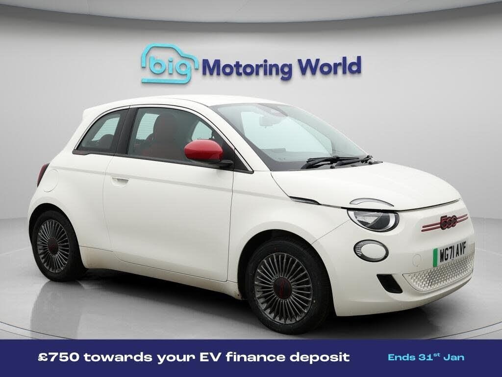 £750 towards your finance depo-Our Fiat 500e comes with optional extras worth £450. Specification includes a range of fantastic features including £750 towards your finance deposit, Satellite Navigation, Rear View Camera, Internet, Bluetooth, Parking Sensors, Cruise Control, Climate Control, Keyless Go, DAB Radio Specification information is supplied by CAPHPI and may vary to the actual car. This data does not form any part of a buying contact. Please check specification prior to purchase in-store. The MOT is valid until January 2027, visit bigmotoringworld.co.uk for more photos, a 360 tour, service history and a free HPI report.Were BIG on peace of mind and this White Fiat 500e has completed our comprehensive 200 point inspection and passed all checks. Its ready for you to drive away with immediate collection in-store. We include a 90-day warranty as standard plus an option to extend for up to 3 years.Reserve this car exclusively for you, safely and securely at bigmotoringworld.co.uk, with a fully refundable £99 deposit. Test drive before you buy, with no commitment, no hassle and a completely haggle free experience. Still searching and want to see thousands more cars? We are BIG on choice with over 8000 cars to choose from.Visit our award winning web site bigmotoringworld.co.uk.Were Big Motoring World and were BIG on what matters to you.