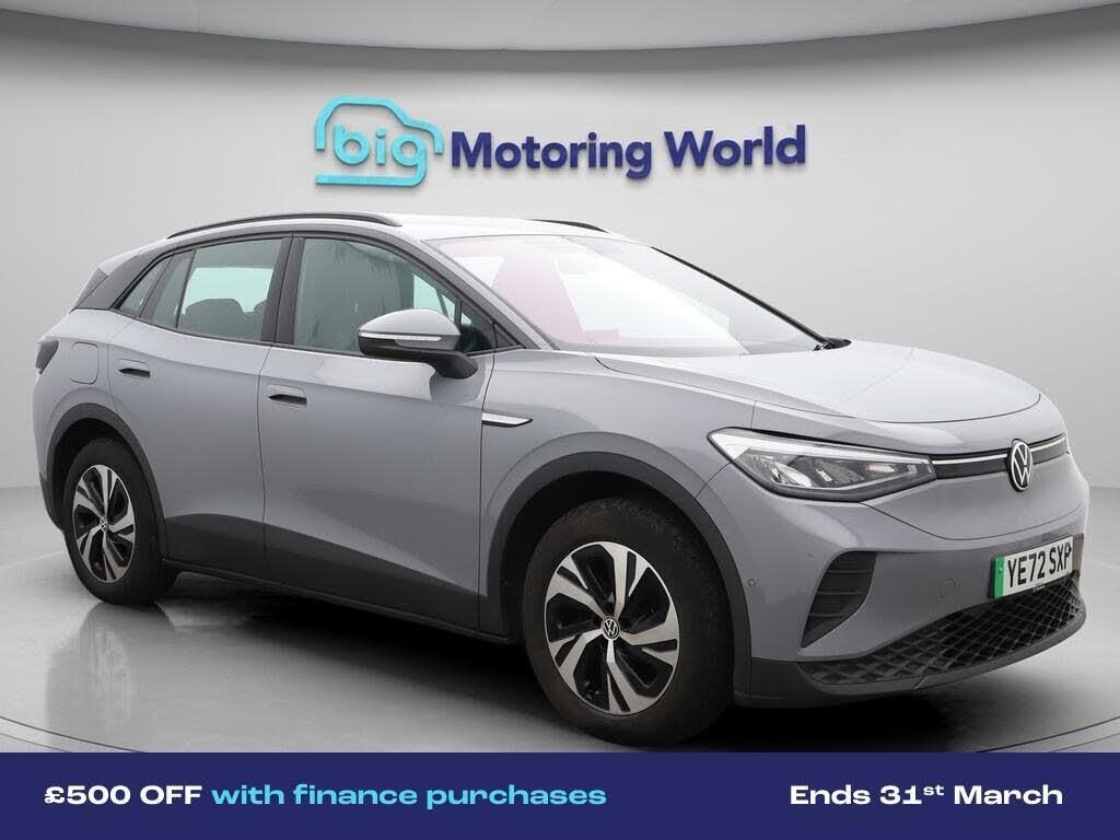 £500 towards your finance depo-Our Volkswagen ID.4 is finished in Grey. Specification includes a range of fantastic features including £500 towards your finance deposit, Comfort Pack, Part Leather Seats, Apple CarPlay, Adaptive Cruise Control, Android Auto, Satellite Navigation, Heated Seats, Rear View Camera, Heated Steering Wheel Specification information is supplied by CAPHPI and may vary to the actual car. This data does not form any part of a buying contact. Please check specification prior to purchase in-store. The MOT is valid until November 2026, visit bigmotoringworld.co.uk for more photos, a 360 tour, service history and a free HPI report.Were BIG on peace of mind and this Grey Volkswagen ID.4 has completed our comprehensive 200 point inspection and passed all checks. Its ready for you to drive away with immediate collection in-store. We include a 90-day warranty as standard plus an option to extend for up to 3 years.Reserve this car exclusively for you, safely and securely at bigmotoringworld.co.uk, with a fully refundable £99 deposit. Test drive before you buy, with no commitment, no hassle and a completely haggle free experience. Still searching and want to see thousands more cars? We are BIG on choice with over 8000 cars to choose from.Visit our award winning web site bigmotoringworld.co.uk.Were Big Motoring World and were BIG on what matters to you.