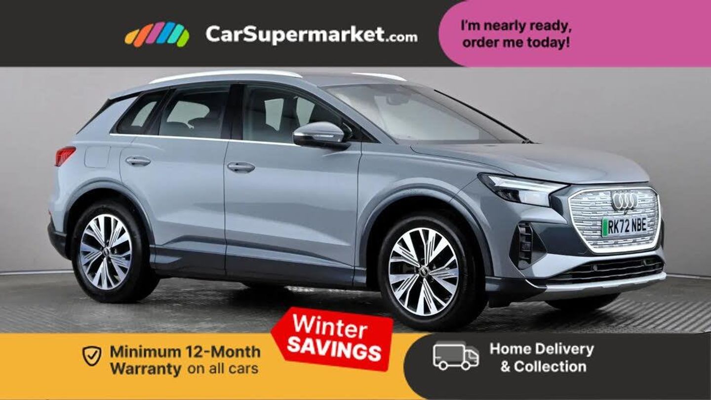 Audi connect safety and service (e-call),Audi drive select,Audi Smartphone Interface with wireless functionality,Audi Virtual Cockpit - 10.25" display,Bluetooth interface,Camera based traffic sign recognition,Lane departure warning system,MMI Navigation Plus with high resolution 11.6 inch touchscreen colour display,Power operated tailgate,Progressive steering,Swerve assist and turn assist,11KW onboard charger,135kW DC charging capability,AC and DC charging access point positioned on the rear right,Compact e-tron charging system,Household plug type G (GB),Industry plug CEE 32 A/230 V/6 h/long + straight,Mode 3 AC charging cable 22 kW,2 USB-C ports with charge and data functions,Audi sound system with 8 speakers,DAB Digital radio,3rd brake light,Acoustic glass windscreen,Aluminium roof rails,Body coloured door mirrors,Contrast bumpers in Manhattan grey,Electrically adjustable/heated/folding/auto dimming door mirrors with integrated LED indications + kerb view function for passenger side,Frameless auto dimming interior rear view mirror,LED daytime running lights,Projection light in the exterior mirrors, e-tron logo projected from the underside of the exterior mirror onto the ground,Rear side wing doors,Rear wiper,Single frame grille with a structured, closed surface within an octagonal shape,3 seat bench in 2nd row,3 zone automatic air conditioning,4 way electric lumbar support for driver and front passenger,Accent surfaces in gloss black - centre console control panel, switch panel and trim on front doors in gloss black,Auxiliary air conditioning,Comfort front centre armrest,Door sill trims with aluminium inlay,Driver/passenger manual seat height adjustment,Front and rear head restraints,Heated front seats,ISOFIX child seat mounting for front passenger and outer rear seats including top tether attachment point of outer rear seats,Single front passenger seat,Steel grey cloth headlining,Gloss styling pack - Q4 E-tron,Non smoking pack - Q4 E-tron,White interior light pack - Q4 E-tron,3x3 point rear seatbelts,Active vehicle alerting system (AVAS),Driver and front passenger airbag with passenger airbag deactivation,Electric child locks,Front side airbags with head airbags and interaction airbag,Pre-sense front with pedestrian and cyclist detection,Seatbelt warning,Tyre pressure loss indicator,Warning triangle and first aid kit,Anti theft alarm,Anti-theft wheel bolts,Keyless Go,Aluminium look interior elements,Inlay in black paint finish, accent surfaces on the instrument panel and centre console in silver paint effect finish,19" 5 W spoke aero alloy wheels with graphite grey gloss finish,Tool kit,Tyre repair kit