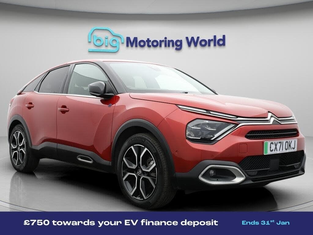 £750 towards your finance depo-Our Citroen e-C4 is finished in Red. Specification includes a range of fantastic features including £750 towards your finance deposit, Head up Display, 18'' alloy wheels, Leather Seats, Satellite Navigation, Privacy Glass, Heated Seats, Rear View Camera, Heated Steering Wheel, Bluetooth Specification information is supplied by CAPHPI and may vary to the actual car. This data does not form any part of a buying contact. Please check specification prior to purchase in-store. The MOT is valid until September 2026, visit bigmotoringworld.co.uk for more photos, a 360 tour, service history and a free HPI report.Were BIG on peace of mind and this Red Citroen e-C4 has completed our comprehensive 200 point inspection and passed all checks. Its ready for you to drive away with immediate collection in-store. We include a 90-day warranty as standard plus an option to extend for up to 3 years.Reserve this car exclusively for you, safely and securely at bigmotoringworld.co.uk, with a fully refundable £99 deposit. Test drive before you buy, with no commitment, no hassle and a completely haggle free experience. Still searching and want to see thousands more cars? We are BIG on choice with over 8000 cars to choose from.Visit our award winning web site bigmotoringworld.co.uk.Were Big Motoring World and were BIG on what matters to you.