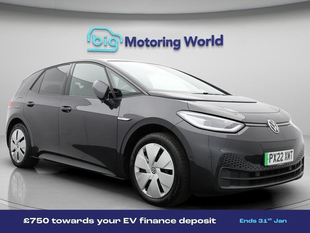 £750 towards your finance depo-Our Volkswagen ID.3 comes with optional extras worth £850. Specification includes a range of fantastic features including £750 towards your finance deposit, Panoramic Roof, Part Leather Seats, Apple CarPlay, Adaptive Cruise Control, Lane Assist, Android Auto, Privacy Glass, Heated Seats, Gesture Control Specification information is supplied by CAPHPI and may vary to the actual car. This data does not form any part of a buying contact. Please check specification prior to purchase in-store. The MOT is valid until January 2027, visit bigmotoringworld.co.uk for more photos, a 360 tour, service history and a free HPI report.Were BIG on peace of mind and this Grey Volkswagen ID.3 has completed our comprehensive 200 point inspection and passed all checks. Its ready for you to drive away with immediate collection in-store. We include a 90-day warranty as standard plus an option to extend for up to 3 years.Reserve this car exclusively for you, safely and securely at bigmotoringworld.co.uk, with a fully refundable £99 deposit. Test drive before you buy, with no commitment, no hassle and a completely haggle free experience. Still searching and want to see thousands more cars? We are BIG on choice with over 8000 cars to choose from.Visit our award winning web site bigmotoringworld.co.uk.Were Big Motoring World and were BIG on what matters to you.