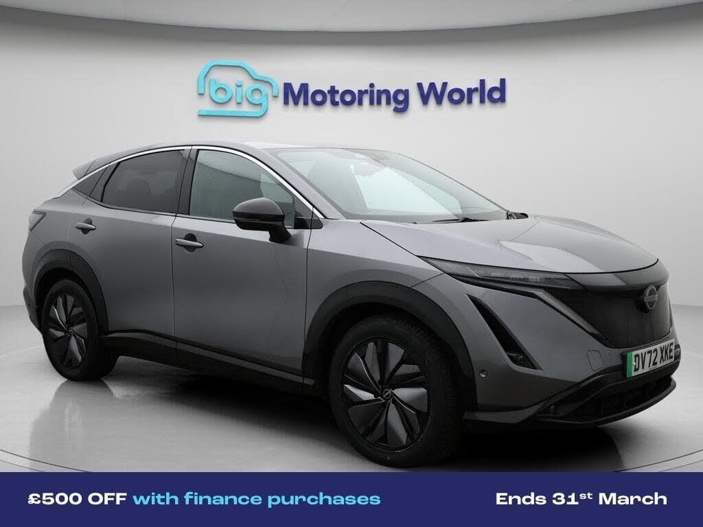 £500 towards your finance depo-Our Nissan ARIYA is finished in Grey. Specification includes a range of fantastic features including £500 towards your finance deposit, Head up Display, Part Leather Seats, Electric Panoramic Roof, Satellite Navigation, Privacy Glass, Heated Seats, Heated Windscreen, Rear View Camera, Memory Seats Specification information is supplied by CAPHPI and may vary to the actual car. This data does not form any part of a buying contact. Please check specification prior to purchase in-store. The MOT is valid until October 2026, visit bigmotoringworld.co.uk for more photos, a 360 tour, service history and a free HPI report.Were BIG on peace of mind and this Grey Nissan ARIYA has completed our comprehensive 200 point inspection and passed all checks. Its ready for you to drive away with immediate collection in-store. We include a 90-day warranty as standard plus an option to extend for up to 3 years.Reserve this car exclusively for you, safely and securely at bigmotoringworld.co.uk, with a fully refundable £99 deposit. Test drive before you buy, with no commitment, no hassle and a completely haggle free experience. Still searching and want to see thousands more cars? We are BIG on choice with over 8000 cars to choose from.Visit our award winning web site bigmotoringworld.co.uk.Were Big Motoring World and were BIG on what matters to you.