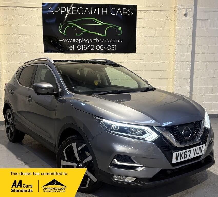 Nissan Qashqai 1.5 dCi Tekna SUV 5dr Diesel Manual Euro 6 (s/s) (110 ps) Registration: VK67 VUV Year: 2017 (67 Plate) Mileage: 85,000 miles Fuel Type: Diesel Transmission: Manual Body Style: SUV Colour: Grey Applegarth Cars are delighted to present this superb example of the ever-popular Nissan Qashqai 1.5 dCi Tekna. Finished in a sleek and timeless grey with an impressive specification, this 2017 (67) plate Qashqai delivers a perfect blend of practicality, comfort, economy and technology. With just 85,000 miles on the clock, this vehicle has been well cared for and offers genuine everyday usability and long-term reliability. Powered by the efficient 1.5 dCi Euro 6 diesel engine with stop/start technology and paired to a smooth-shifting manual gearbox, this Qashqai returns excellent fuel economy while delivering responsive performance. The Euro 6 compliant engine ensures lower emissions and reduced road tax costs, making this an economical choice for both urban and motorway driving. Detailed Specification: Comfort and Interior Features Full leather upholstery for a premium and comfortable cabin ambience Heated front seats with multiple adjustment settings for long journey comfort Dual-zone automatic climate control to keep driver and passengers comfortable in all seasons Electric panoramic glass roof with powered sunblind allowing light into the cabin Electrically adjustable driver's seat for personalised comfort Front and rear floor mats Technology and Infotainment NissanConnect satellite navigation system with clear mapping and route guidance BOSE premium audio system for exceptional sound quality DAB digital radio and Bluetooth connectivity for hands-free phone and audio streaming USB and AUX inputs for device connectivity Multi-function steering wheel with audio, phone and cruise control buttons Safety and Driver Assistance 360-degree Around View Monitor with front and rear parking sensors for confident manoeuvring Rear-view camera providing added visibility when reversing Lane departure warning system enhancing on-road awareness Blind spot monitoring to support safer lane changes Traffic sign recognition to assist with road speed awareness Automatic LED headlights with auto on/off function and dusk sensor Front, side and curtain airbags for comprehensive occupant protection Exterior and Practical Features Striking 19-inch alloy wheels enhancing the Qashqai's road presence LED daytime running lights and rear LED lights Electric folding door mirrors with heated function Roof rails providing practical attachment points for carries and accessories Large boot with ample load space and flexible rear seats Don't miss the opportunity to own this high-specification Nissan Qashqai Tekna. Contact Applegarth Cars today to arrange a viewing or test drive, and experience for yourself why the Qashqai continues to be one of the UK's favourite SUVs. Applegarth Cars is a trusted used car dealership dedicated to providing high-quality, pre-owned vehicles at competitive prices. With a strong commitment to customer satisfaction, we offer a diverse selection of cars, from reliable family vehicles to performance and luxury models. We pride ourselves on transparency, fair pricing, and exceptional service. Whether you’re buying, selling, or looking for finance, we make the process smooth and hassle-free. Visit Applegarth Cars today and drive away with confidence.