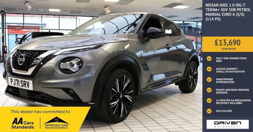 NISSAN JUKE 1.0 DIG-T TEKNA+ SUV 5DR FINISHED IN GUN METALLIC GREY WITH BLACK PEARL ROOF AND COMPLIMENTED WITH BLACK LEATHER INTERIOR, THIS VEHICLE HAS BEEN VERY WELL CARED FOR AND MAINTAINED WITH DOCUMENTED SERVICE HISTORY CARRIED OUT AT 8000, 16932, 26515, 36461 MILES PLUS COMPREHENSIVE PRE DELIVERY HEALTH CHECK COMPLETED PRIOR TO SALE AT 36417 MILES. KEY FEATURES INCLUDE ALLOY WHEELS, COLOUR DISPLAY SCREEN, SMARTPHONE INTEGRATION, DUAL ZONE CLIMATE CONTROL, BOSE AUDIO SOUND SYSTEM, ELECTRIC HEATED FOLDING DOOR MIRRORS, DOOR AMBIENT LIGHTING, USB/AUX CONNECTORS, DRIVE MODES, INTELLIGENT KEY, LANE ASSIST, SPORT SEATS, MULTIFUNCTIONAL STEERING WHEEL, NISSAN CONNECT TOUCHSCREEN, FRONT AND REAR PARKING SENSORS, SPEED LIMITER, CRUISE CONTROL, AUTOMATIC WIPERS, AUTOMATIC LIGHTS, BLUETOOTH, WIFI AND VOICE RECOGNITION PLUS MUCH MORE. COMMITTED TO AA CARS STANDARDS: 3 MONTHS OR 3000 MILES WARRANTY INCLUDED WITH AN OPTION TO UPGRADE: 12 MONTHS AA BREAKDOWN RECOVERY INCLUDED: £75.00 CONTRIBUTION TOWARDS YOUR NEXT SERVICE/MOT AT ANY AA CARS STANDARD APPROVED WORKSHOP: WE STAND BY THE QUALITY OF OUR VEHICLES. WITH THE PURCHASE OF THIS VEHICLE, YOU WILL RECEIVE 3 MONTHS OR 3000 WARRANTY, 12 MONTHS AA BREAKDOWN RECOVERY, GIVING YOU ADDITIONAL PEACE OF MIND AND PROTECTION. ALL OUR CARS COME WITH AT LEAST 6 MONTHS MOT AND PRE SALE HEALTH CHECK AND ROAD TEST. OUR PROFESSIONAL TEAM ENSURES YOUR VEHICLE STAYS IN TOP CONDITION, AND YOU ENJOY A HASSLE-FREE OWNERSHIP EXPERIENCE. 4.7 STARS ON GOOGLE WITH OVER 550 REVIEWS: JOIN OUR COMMUNITY OF SATISFIED CUSTOMERS! OUR DEALERSHIP IS PROUD TO HAVE A 4.7 STAR RATING ON GOOGLE, BACKED BY OVER 550 POSITIVE REVIEWS. WE ARE COMMITTED TO PROVIDING EXCELLENT SERVICE AND HIGH-QUALITY VEHICLES. This Vehicle Comes Equipped with High Specification, Which Includes: - Drive this car home with complete confidence and satisfaction: All cars proudly offered by driven group are rigorously inspected, hpi checked and prepared to the highest standard To drive this car home, visit www.drivegroup.co.uk or call 01642-601999 to arrange an appointment with our sales team Please note we do not operate an organised distance selling scheme as defined by the consumer contracts (cancellation, information and additional charges) regulations 2013. Therefore, even if you choose to not view your vehicle at our premises prior to purchase,you will not be entitled to cancel your order under any 14 day cancellation period. All other statutory rights remain unaffected. Whilst every effort has been made to ensure the accuracy of the information contained in this website, please check with us about any item which may affect your decision to purchase. Driven motor group shall not be liable for any errors, inaccuracies or delays in content.
