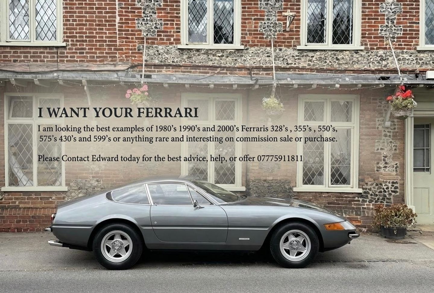 I WANT YOUR FERRARI I am looking the best examples of 1980's 1990's and 2000's Ferraris 328's , 355's , 550's, 575's 430's and 599's or anything rare and interesting on commission sale or purchase. Please Contact Edward today for the best advice, help, or offer 07775911811.