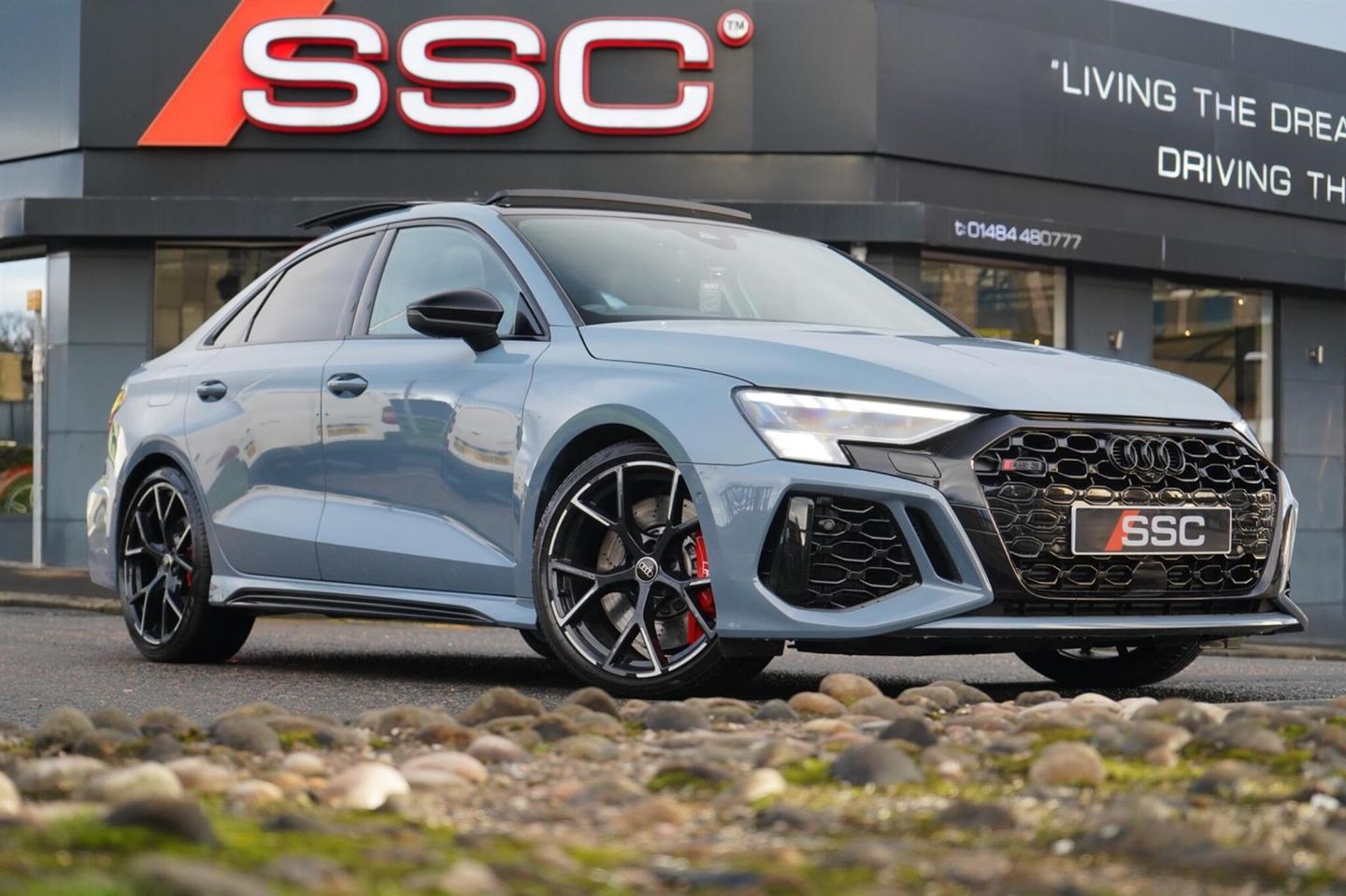 Stunning RS3 Saloon Vorsprung Finished In Kemora Grey With Black Honeycomb Quilted Fine Nappa Leather Interior. Fantastic Spec Inc: Ghost Immobiliser System, Panoramic Glass Sunroof, RS Sports Exhaust, Top Speed Increase To 174 Mph, Driver Assistance Pack, Head Up Display, Adaptive Cruise Control, Rear Camera, Park Assist, Hill Hold, Traffic Sign Recognition, Bang & Olufsen 3D Premium Surround Sound, Electric And Heated Super Sports Seats With Driver Memory, RS Specific Virtual Cockpit, Digital Matrix Headlights, Full Decorative Carbon Trim, Ambient Lighting Pack, RS Projection LED Door Courtesy Lights, Black Styling Pack, Advanced Key, Electric Folding Mirrors With Memory, Auto Dimming Mirrors, Storage And Luggage Pack, Audi Connect, Smartphone Interface, DAB, MMI Navigation Plus, Drive Select, Progressive Steering, 19'' 5 Y-Spoke RS Alloys With Graphic Print, Split Folding Rear Seats, 4 Way Lumbar Support. This RS3 Comes With Full Audi Service History, Remainder Of Audi Pre Paid Service Plan and Manufacturers Warranty.