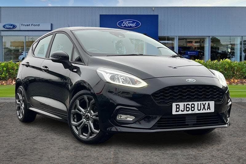 Bluetooth system, Electric power steering, Ford easy fuel, Trip computer, Body colour bumpers, Body colour door handles, Body colour large rear spoiler, Chrome door handles, Chrome lower window surround, Cornering front fog lights, Electric front windows/one touch facility, Privacy glass, Quickclear heated windscreen, Rear wiper, Rugged body styling kit with active front wing badges, Tinted glass, Unique ST-Line upper grille & full bodystyling kit with ST-Line wing badges, 12V Accessory socket in centre console, 3 spoke flat bottomed leather steering wheel, 60/40 split folding rear seat, Adjustable head restraints, Black headlining, Boot carpet, Centre console with armrest and illuminated cupholders, Chrome inner door handles, Cloth upholstery, Footwell illumination, Front and rear velour floor mats, Front map reading lights, Front seat and rear pockets, Height adjustable driver's seat, Illuminated glovebox, Leather gear knob, Leather trimmed handbrake handle, Load area light, Manual air conditioning, Overhead console with sunglasses holder, Pollen filter, Rake/reach adjustable steering wheel, Rear centre head restraint, Sports front seats, Sports pedals, 3 point seatbelts on all rear seats, ABS+EBA, Curtain airbags, Driver and passenger airbags, Drivers knee airbag, Electronic stability control with hill start assist, Front passenger airbag deactivation, Front side airbags, Seatbelt warning, Tyre pressure monitoring system