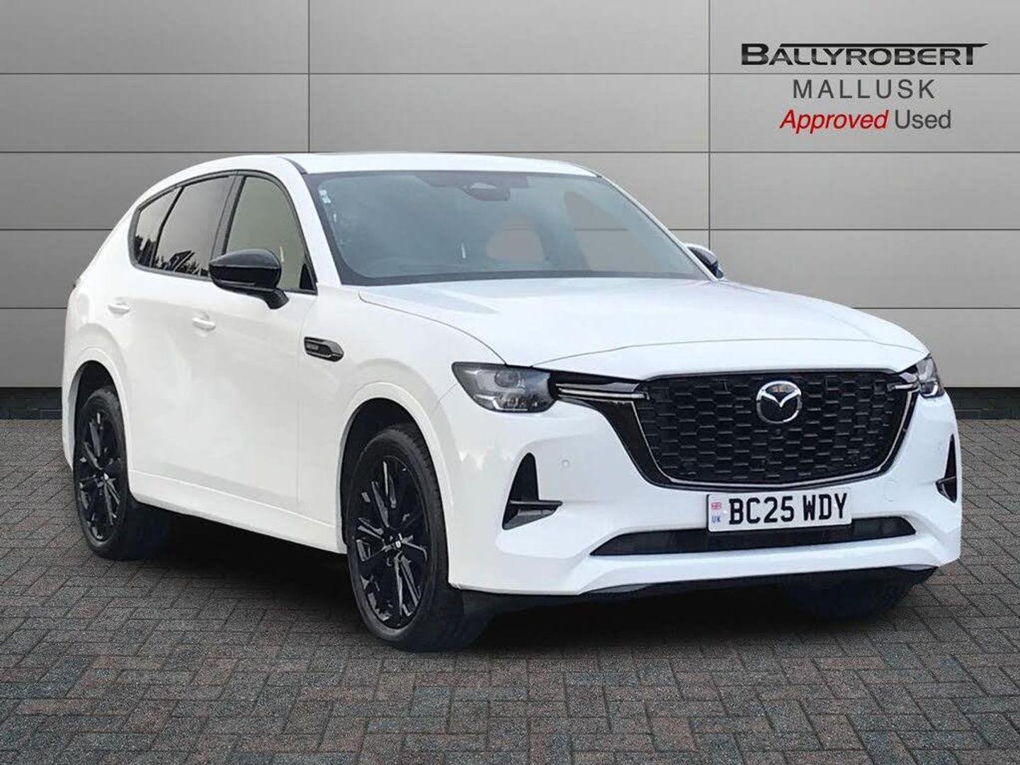 Emergency lane keeping with blind spot assist, Low washer fluid warning light, 12.3" Colour entertainment centre display with mazda connect infotainment, 12.3" TFT Colour display, Adjustable speed limiter, Blind spot assist, Blind spot monitoring with rear cross traffic alert, Distance alert system, Driver attention alert system, Driver Monitoring with personal identification, E-call with GPS, Emergency stop signalling system, Exit warning function, Front and rear parking sensors, Ingress / Egress support and automatic driver position guide, Integrated bluetooth, Intelligent speed assist, Kinematic posture control, Lane keep assist system (LAS) with Lane departure warning system (LDWS), Mazda Driver Personalisation System, Mazda hybrid navigation system with european mapping, Multimedia Commander, PAS, Power lift gate with handsfree function, Power start/stop button, Speed alert, Traffic sign recognition enhanced with mandated excessive speed warning, Trip computer, Windscreen projected colour active driving display, Wireless apple car play/android Auto, Internal Combustion Engine Sound Emulator, Mi-Drive (Normal, Sport, Off-road, Towing and EV mode), Paddle shift, AM/FM and DAB radio, Bose surround sound system with 12 Speaker, Bose center point, Bass match and audio pilot technology, Steering wheel mounted audio/bluetooth controls, USB-C inputs (x2 front and x2 rear), Auto dimming driver's door mirror, Automatic headlight levelling, B-pillar and C-pillar garnishes in gloss black finish, Body colour roof spoiler, Body coloured bumpers, Body coloured lower bumper, wheel arch and side mouldings, Coming/leaving home lighting function, Dark plated headlight lense, Dark plating finish signature wing in front grille, Dark plating front side garnish, Differentiated front bumper design to accentuate the intake, Dusk sensing headlights, Electric front/rear windows with one touch auto up/down, Electric panoramic sunroof, Electrically adjustable, heated auto power folding door mirrors with memory, Frameless auto dimming interior rear view mirror, Front kodo turn signal, Front wiper de-icer, Gloss black door mirrors, Headlight washers, High beam control, Honeycomb radiator grille in piano black, LED 3rd brake light, LED rear signature combination lamps, Rain sensing front wipers with adjustable sensitivity and speed, Rear side wing doors, Rear wiper, Roof pillars and roof lining finished in lighter colour to soften the overall look, Signature LED daytime running lights, Silver decoration panel, 12v power outlet - front, 12V socket in boot, 3 height adjustable rear headrests, 3 seat bench in 2nd row, 40/20/40 split folding rear seats with quick levers in the boot, Ambient lighting, Cargo net, Chrome interior trim accents with steering wheel centre bezel, surround of engine start / stop button and glove box handle, Door panel trim vinyl leather with armrest, Driver and front passenger two rear grab handles with rear coat hooks, Driver and front passenger visors with covered vanity mirror and driver ticket holder, Driver seat electric tilt, slide, recline, height and lumbar adjustment, Driver, front passenger and two rear door pockets, Driver/passenger front seatback pockets, Dual zone climate control air conditioning with rear air vents, Electric telescopic and tilt adjustment steering wheel, Featuring black vinyl leather dashboard trim with titanium coloured accents, Folding rear centre armrest with two cup holders, Front centre storage with two cupholders, Front down lamp with front and rear foot lamps, Front headrests, Front passengers seat electric slide, recline, height and lumbar adjustment, Front seat ventilation with 3-stage setting, Glovebox illumination, Heated front seats with 3 stage setting, Heated leather wrapped steering wheel, Heated outer rear seats with 3-stage setting, ISOFIX child seat anchorage points attached on outer rear seats, Karakuri tonneau cover, Leather wrapped gear shift knob, LED illumination luggage compartment, Nappa leather upholstery, Practical and spacious front centre armrest storage, Rear seat recline function for rear passenger comfort, Remote fold down rear seats, Remote pre-heating/cooling, Roof lining (ceiling and pillars) - Black, Roof mounted sunglasses holder, Single front passenger seat, Convenience Pack - CX-60, Driver Assistance Package - CX-60, 3 point ELR front seat belts x2 with pretensioners, 3 point ELR rear seat belts, Active bonnet, Anti-lock braking system (ABS), Drivers knee airbag, DSC - Dynamic Stability Control, Electronic parking brake with auto disengage function and auto hold function, Front and rear curtain airbags, Front dual stage driver and single stage front passenger airbags, Front passenger airbag cut-off switch, Front side airbags, Front smart city brake support, Hill decent control, Hill launch assist, Manual rear child locks, Seatbelt reminder for driver/front passenger and rear seats, Traction control, Tyre pressure monitoring system (TPMS), Remote central locking with deadlocking and automatic door lock when driving, Smart keyless entry, Thatcham accredited alarm and immobiliser, Mesh metal film centre console panel, 20" Black metallic alloy wheels, Emergency tyre repair kit