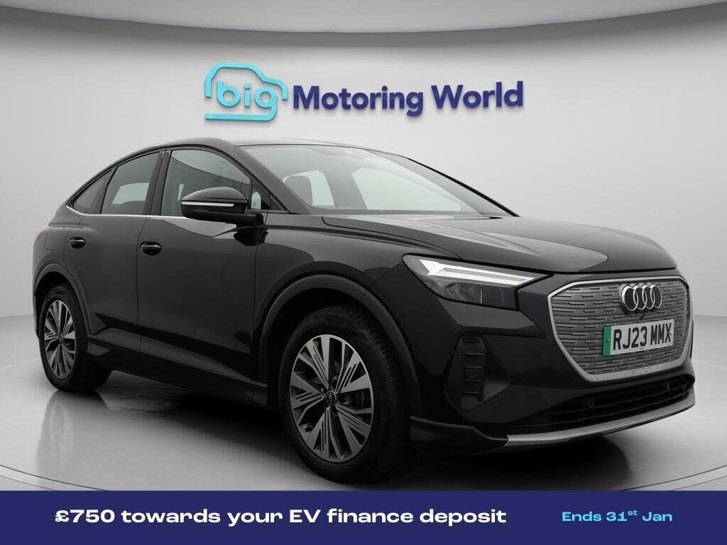 £750 towards your finance depo-Our Audi Q4 e-tron is finished in Black. Specification includes a range of fantastic features including £750 towards your finance deposit, 19'' Alloy wheels, Apple CarPlay, Lane Assist, Android Auto, Satellite Navigation, Heated Seats, Rear View Camera, Bluetooth, Parking Sensors Specification information is supplied by CAPHPI and may vary to the actual car. This data does not form any part of a buying contact. Please check specification prior to purchase in-store. The MOT is valid until January 2027, visit bigmotoringworld.co.uk for more photos, a 360 tour, service history and a free HPI report.Were BIG on peace of mind and this Black Audi Q4 e-tron has completed our comprehensive 200 point inspection and passed all checks. Its ready for you to drive away with immediate collection in-store. We include a 90-day warranty as standard plus an option to extend for up to 3 years.Reserve this car exclusively for you, safely and securely at bigmotoringworld.co.uk, with a fully refundable £99 deposit. Test drive before you buy, with no commitment, no hassle and a completely haggle free experience. Still searching and want to see thousands more cars? We are BIG on choice with over 8000 cars to choose from.Visit our award winning web site bigmotoringworld.co.uk.Were Big Motoring World and were BIG on what matters to you.