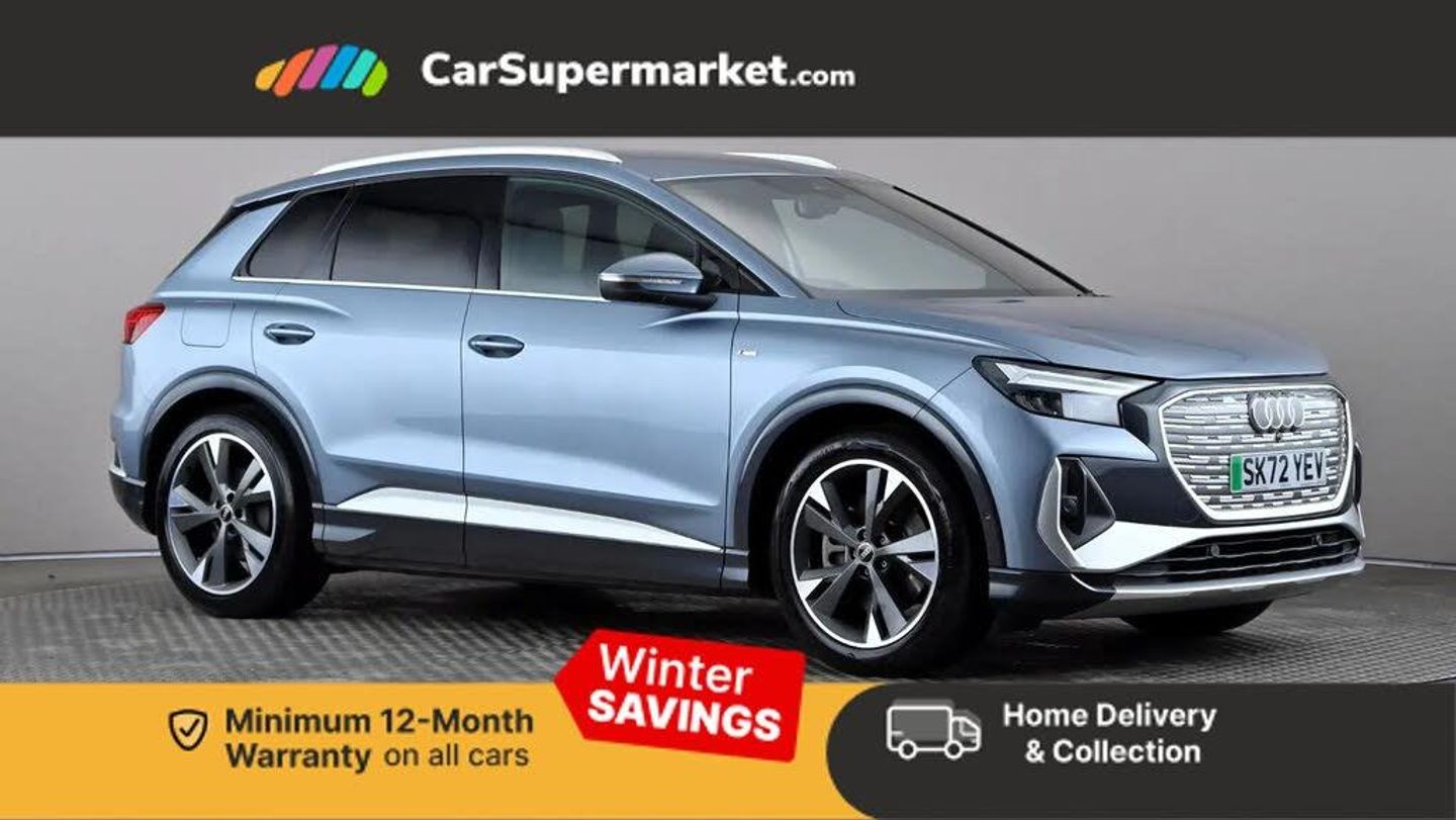 Apple CarPlay/Android Auto, Audi Virtual Cockpit, Bluetooth, Traffic Sign Recognition, Lane Departure Warning, Sat Nav, Digital Radio, Privacy Glass, Heated Front Seats;This 2023 Audi Q4 e-tron S line boasts an exceptionally low mileage of just 13,328 miles, coupled with a clear vehicle history check and an MOT valid until January 2027, ensuring peace of mind for its next owner. This electric four wheel drive model features a substantial 82 kWh battery, offering a maximum range of 303 miles when new. The last service was completed on 19th January 2026 at 13,326 miles. The S line trim enhances its appeal with desirable features such as the Comfort and Sound Package, which includes adaptive cruise control, a rear parking camera, and a premium branded sound system. Additionally, it is equipped with stylish 20 inch graphite grey alloy wheels, Bluetooth connectivity, and heated front seats for added comfort.