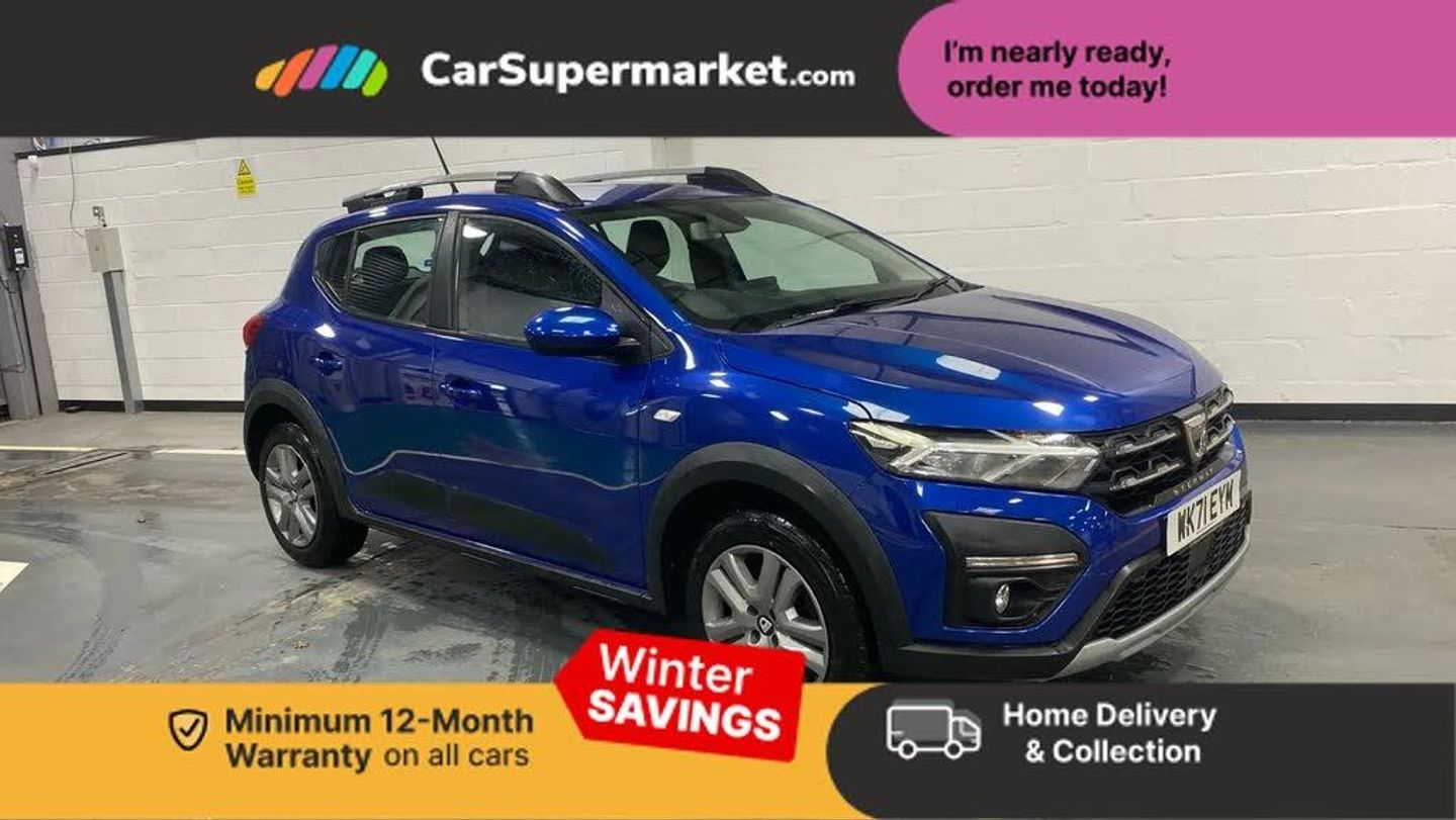 3.5" TFT instrument panel with on-board computer,Cruise control with speed limiter,eCall emergency call system,Eco mode,Electric power assisted steering,Rear parking sensors,Rev counter,Reversing camera,Stop/start system,8" Media display - DAB radio, smartphone replication, bluetooth, 4 speakers, Apple CarPlay and Android Auto,USB connection for data transfer and charging,USB socket,3 speed windscreen wipers,Auto lighting,Automatic wipers,Body colour door handles,Body colour door mirrors,Body coloured bumpers,Chrome longitudinal roof bars,Chrome radiator grille,Electrically adjustable and heated door mirrors,Front fog lights,Heated rear window,High level third brake light,LED automatic daytime running lights,LED Y-shape Dacia signature lighting,Modular roof bars,One touch electric front windows,Rear electric windows,Rear wash/wipe,Stepway inscription on radiator grille and roof bars,Tinted windows,1/3 to 2/3 split folding rear seats,12 volt front socket,12 volt rear socket,3 height adjustable rear headrests,Driver + passenger vanity mirrors,Fabric upholstery,Fixed smartphone holder on dashboard,Front armrest,Gear shift indicator,Height adjustable driver seat,Height adjustable front headrests,Height/depth adjustable steering wheel,Isofix points for child seats in both outer rear seats,Manual air conditioning,Satin chrome interior door handles,Satin Chrome/Copper orange air vents,Soft feel steering wheel,Steering wheel controls,3x3 point rear seatbelts,ABS and Emergency brake assist,Automatic emergency braking system,Child locks on rear doors,Door open warning,Driver airbag,ESC (Electronic Stability Control),ESP + Hill Start Assist,Front curtain airbags,Front seatbelt pretensioners,Front side airbags,Height adjustable front seatbelts,Passenger airbag,Seatbelt reminder for driver and front passenger,Tyre pressure monitor,Automatic central locking,Immobiliser,Keyless entry,Remote central locking,Decopart on instrument panel and door with textile,16" Flex wheels with full wheel cap,Cloth - Titanium Black,Iron Blue
