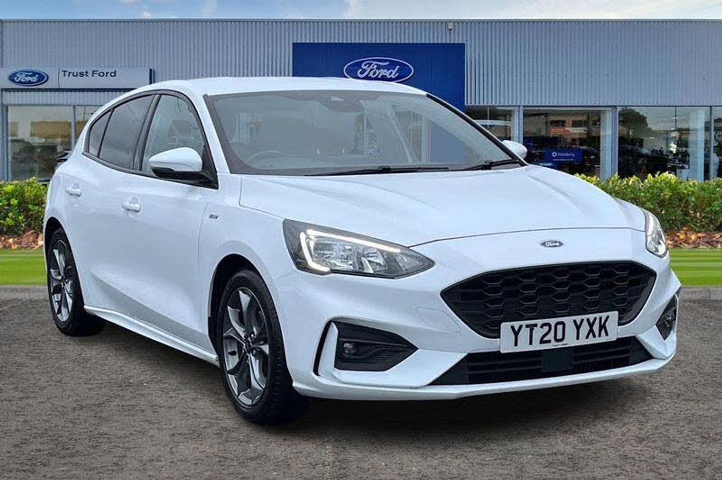 Bluetooth system, Digital clock, Easy fuel capless refuelling system, Eco mode, Ford pass connect, Ford SYNC 3 with 8 TFT touchscreen, and app link Android auto/Apple carplay, Intelligent speed assist, Lane keeping aid with lane departure warning, PAS, Selectable drive mode, Trip computer, 'Quickclear' heated windscreen/heated washer jets, Auto headlamps (on/off), Body colour large rear spoiler, Body colour side skirt, Body coloured bumpers, Body coloured door handles, Body coloured electrically operated and heated door mirrors with side indicators, Electrically operated front and rear windows with one touch opening and closing, Front variable intermittent wipers with electric wash, Halogen reflector headlamps, Heated rear window, LED daytime running lamp, LED front fog lamps with cornering function, Polished twin tailpipe, ST-Line upper and lower grille with full body styling kit and wing badges, Tailgate wash/wipe, 3 spoke flat bottomed leather steering wheel with red stitching, 60/40 split back and cushion rear seats with 2 height adjustable headrests, Alloy finish pedals, Aluminium gear knob, Centre console with armrest, Cloth upholstery with red stitching, Dark headliner, Driver's lumbar support, Front floor mats, Height adjustable front headrests, Isofix child seat preparation, Manual air conditioning, Reach + rake adjustable steering column, Rear centre headrest, ABS+Electronic Brake force Distribution, Auto hold function, Driver airbag, Electronic parking brake, Electronic stability control, Front and rear seatbelt reminder, Front inertia reel height adjustable seatbelts with pre-tensioners, Front passenger airbag, Front side airbags, Hill start assist, Passenger airbag deactivate switch, Post collision braking, Pre collision assist with autonomous emergency braking and pedestrian/cyclist detection, Side curtain airbags, Three rear inertia reel lap/diagonal seatbelts, Tyre pressure monitoring system