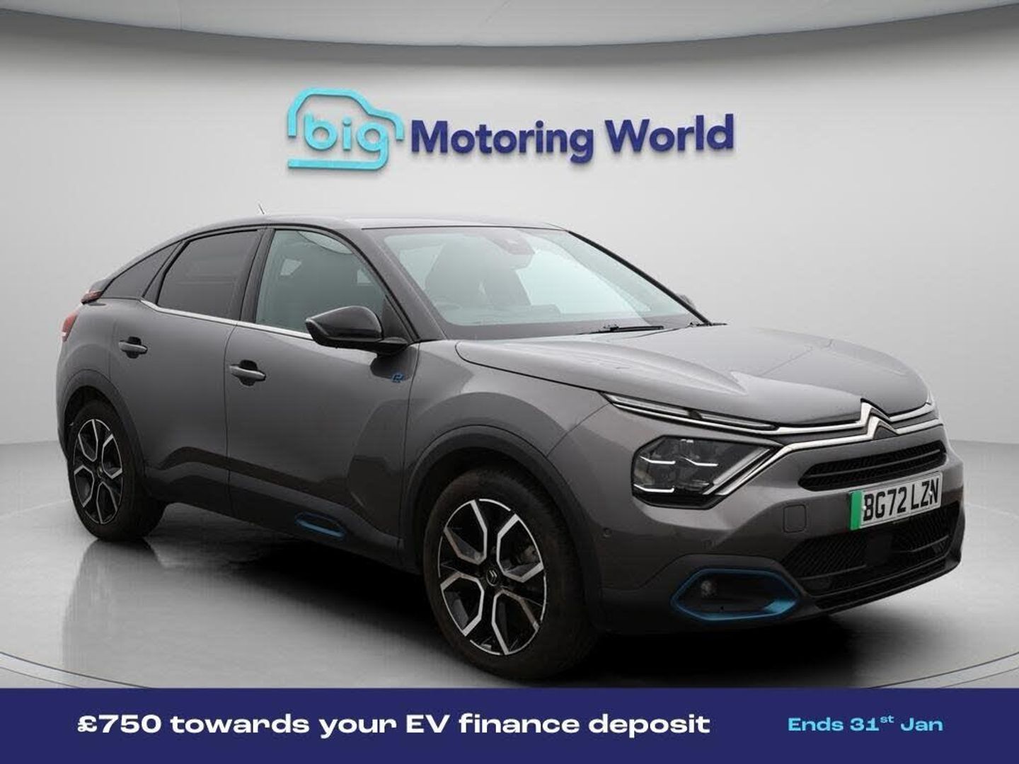£750 towards your finance depo-Our Citroen e-C4 is finished in Grey. Specification includes a range of fantastic features including £750 towards your finance deposit, Head up Display, 18'' alloy wheels, Leather Seats, Apple CarPlay, Android Auto, Satellite Navigation, Privacy Glass, Heated Seats, Rear View Camera Specification information is supplied by CAPHPI and may vary to the actual car. This data does not form any part of a buying contact. Please check specification prior to purchase in-store. The MOT is valid until August 2026, visit bigmotoringworld.co.uk for more photos, a 360 tour, service history and a free HPI report.Were BIG on peace of mind and this Grey Citroen e-C4 has completed our comprehensive 200 point inspection and passed all checks. Its ready for you to drive away with immediate collection in-store. We include a 90-day warranty as standard plus an option to extend for up to 3 years.Reserve this car exclusively for you, safely and securely at bigmotoringworld.co.uk, with a fully refundable £99 deposit. Test drive before you buy, with no commitment, no hassle and a completely haggle free experience. Still searching and want to see thousands more cars? We are BIG on choice with over 8000 cars to choose from.Visit our award winning web site bigmotoringworld.co.uk.Were Big Motoring World and were BIG on what matters to you.