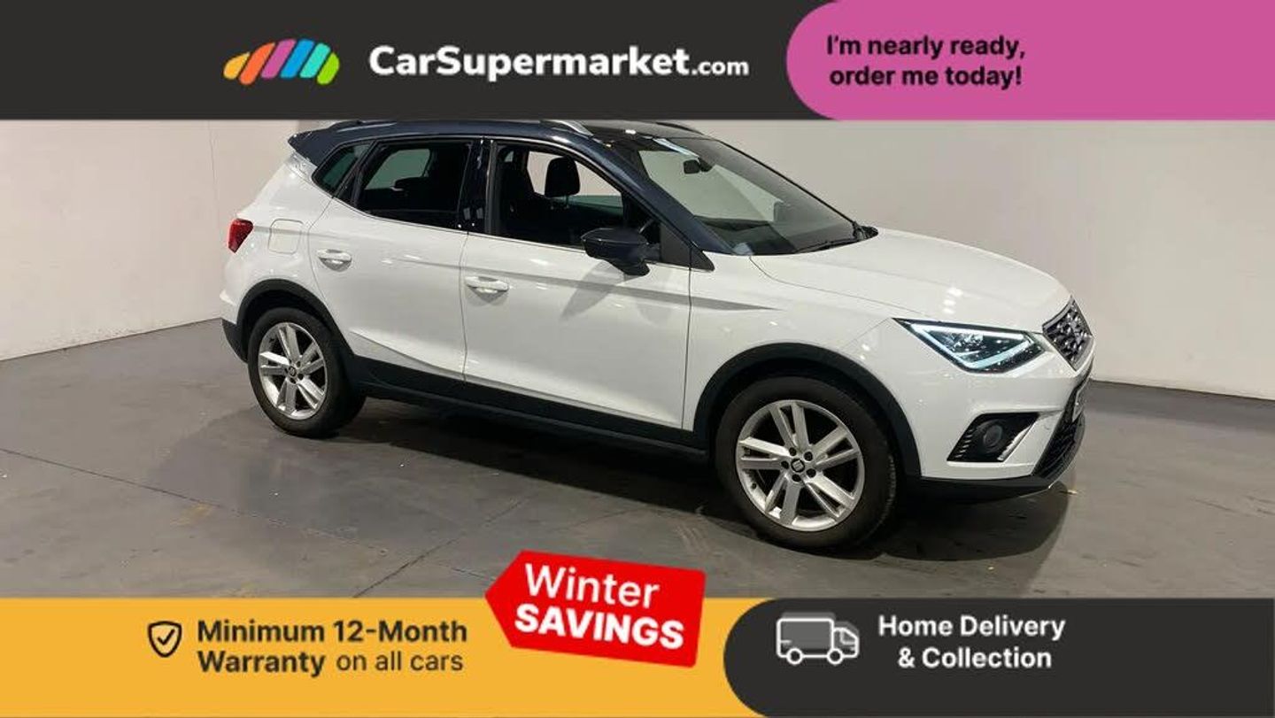 'Lights On' Reminder warning buzzer,Cruise control,Digital clock,Electric speed sensitive power steering,Full Link Smartphone Integration with Mirror Link, Apple Car Play, Google Android Auto with USB Type C cable for Apple and Android compatibility,Low fuel warning light,Outside temperature display,Rear parking sensor,RPM counter,SEAT Drive profile - Four different models normal-sport-eco-individual, steering response, throttle response,Trip computer,Sports suspension,6 speakers,Bluetooth interface for hands free and audio streaming,DAB digital radio and AM/FM radio,Steering wheel mounted audio controls,Anti theft roof antenna,Auto dimming interior rear view mirror,Automatic activation of hazard warning lights,Automatic headlights,Body coloured bumpers,Body coloured door handle inserts,Chrome front grille frame,Chrome roof rails,Chrome window trim,Coming/leaving home lighting function,Dark tinted rear windows,Electric front/rear windows with one touch/auto up/down,Electrically adjustable, heated and folding door mirrors,Full LED headlights dipped and mainbeam + front and rear fog lights,LED daytime running lights,LED rear tail lights and licence plate lights,Rain sensing wipers,Rear window wash/wipe,Roof colour door mirrors,Twin exhaust pipe styling hidden exhaust pipe,Visible VIN plate,Windshield wiper with intermittent control and potentiometer,2 cupholders,60/40 split folding rear seat,Black interior roof,Double boot floor,Driver sunvisor with covered mirror + card holder,Dual zone climate control,Dust/pollen filter,Front courtesy light with front reading lights,Front sport seats,Gear shift indicator,Height adjustable front seats,Height/reach adjustable steering column,Illuminated boot,Instrument lighting with brightness control,Interior footwell lighting,ISOFIX points in outer rear seats with top tether anchorage points,Multi-colour ambient interior lighting,Nora cloth upholstery,Passenger sunvisor with vanity mirror,Perforated flat bottomed leather steering wheel/gear knob/handbrake with red stitching and FR logo,Two front and three rear height adjustable headrests,Connectivity pack plus - Arona,Interior chrome pack - Arona,3 point seatbelts on all rear seats,ABS,Active front headrests,Child locks on rear doors,Driver and front passenger airbags with front passenger airbag de activation, front side and curtain airbags,Electronic stability control,Emergency Brake Assist (EBA) and front assist,Front and rear seatbelt reminder,Hill hold control,Multi-Collision braking,Tiredness recognition system,Traction control,Tyre pressure monitoring system,Alarm with back-up horn,Electronic engine immobiliser,Locking wheel bolts,Remote central locking + deadlocks,Tow away protection,Interior chrome line trim,Leatherette dashboard,17" Dynamic alloy wheels