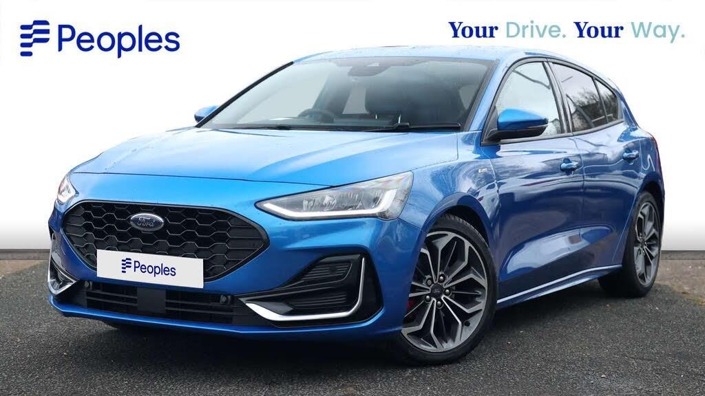 12.3" Digital instrument cluster, Bluetooth system, Digital clock, Easy fuel capless refuelling system, Eco mode, Ford SYNC4 Nav with 13.2'' touchscreen, DAB, Emergency Assistance, Apple Carplay & Android Auto, B&O Premium Audio with 10 speakers, FordPass Connect, Lane keeping system - lane keeping alert and lane keeping aid, PAS, Rev counter, Selectable drive mode, Service interval indicator, Trip computer, Wireless charging pad, Sports tuned suspension, 2 USB ports, Auto headlamps (on/off), Body coloured door handles, Electrically operated front and rear windows with one touch opening and closing, Electrically operated heated power fold door mirrors with puddle lamp with side indicators, Front variable intermittent wipers with electric wash, Heated rear window, LED daytime running lamp, LED rear lamps, LED third brake light, Polished twin tailpipe, Privacy glass, Quickclear heated windscreen, Rain sensor, Rear side wing doors, Tailgate wash/wipe, Unique ST-Line grille, full bodystyling kit, and large body coloured rear spoiler, 3 rear headrests, 3 seat bench in 2nd row, Dual zone electronic air temperature control, Full sensico premium upholstery, Height adjustable front headrests, Isofix child seat preparation, Load through ski hatch, Manual 4-way passenger seat adjusts, Power 4-way driver seat adjust, with power lumbar adjust, Reach + rake adjustable steering column, Single front passenger seat, Winter pack - Focus, 3x3 point rear seatbelts, ABS+Electronic Brake force Distribution, Auto hold function, Driver airbag, EDL traction control, Electronic parking brake, Electronic stability control, Front and rear seatbelt reminder, Front inertia reel height adjustable seatbelts with pre-tensioners, Front passenger airbag, Front side airbags, Passenger airbag deactivate switch, Post collision braking, Pre collision assist with autonomous emergency braking and pedestrian/cyclist detection, Red brake calipers, Remote/power child rear door locks, Side curtain airbags, Three rear inertia reel lap/diagonal seatbelts, Tyre pressure monitoring system, Keyless entry and keyless start, MyKey system, Remote central locking & engine immobiliser, Thatcham alarm with power door dead locks, 18" 5x3 spoke pearl grey high gloss machined finish alloy wheels with mini spare wheel