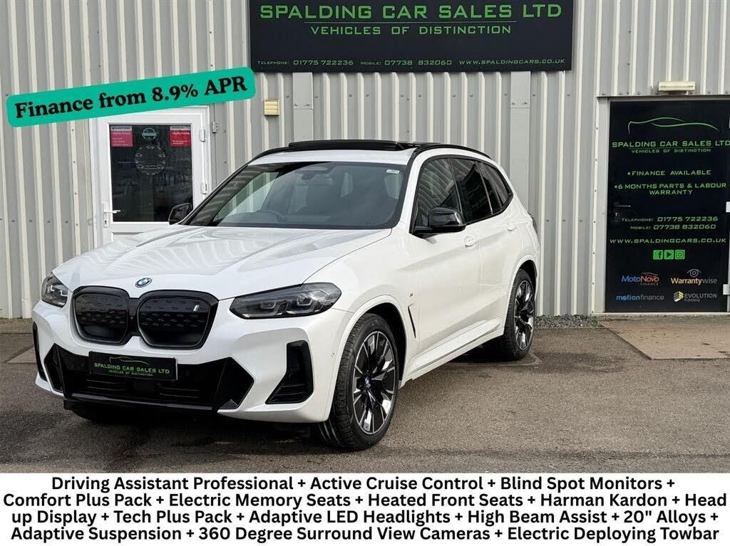 We are Delighted to Offer this Stunning High Specification Full BMW Service History, BMW IX3 210KW 80KWh M Sport Pro Auto finished in Mineral White Metallic with Contrasting Black Vernasca Leather interior with Royal Blue Stitching. The specification of this BMW IX3 210KW 80KWh M Sport Pro Pack is as follows - Mineral White Metallic - Black Vernasca Leather Sports Seats - Electrically Adjustable Drivers & Passengers Seats with Extendable Knee Support & Memory Facility - Heated Front Seats - Lumbar Support - Air Con - Tri Zone Climate Control with Independent Rear Controls - Electric Front & Rear Windows - Electric Tilt & Slide Panoramic Roof - Electric Folding Mirrors with Auto Dimming Lenses - Live Operating Area Pro - Professional Satellite Navigation & Media System - RDS DAB Digital Stereo - USB Interface - Bluetooth Music Streaming - BMW Apps Inc Spotify - Apple CarPlay - Android Auto - Harman Kardon Surround Sound System - Gesture Control - Connected Drive Services - Bluetooth Phone - Wireless Charging - Drivers Assistant Professional - Adaptive Cruise Control with Assisted Driving Mode - Active Cruise Control with Distance Control - Speed Limiter - Blind Spot Monitors - Active Lane Guidance - Steering & Lane Control Assist - Front Collision Warning - Lane Departure Warning - Cross Road Warning - Drive Recorder - Head Up Display - Virtual Cockpit - Heated Nappa Leather M Sport Multi Function Steering Wheel - Ambient Lighting - Comfort Access - Electroplated Interior Switches - 3 Pin Charger & Type 2 Cable - BMW IX3 210KW 80KWh M Sport Hybrid Bodystyling - M Sport Aero Pack - 20" M Double Spoke Alloys finished in Black & Silver 890M - Variable Damper Control - Adaptive Suspension - M Sport Brakes - Adaptive LED Headlights with Signature LED Daytime Running Lights - High Beam Assist - Reversing Assistant - Park Assist - Self Park - 360 Degree Surround View Cameras & Guidance Lines - 3D Remote View - Front & Rear Parking Sensors - Privacy Glass - Electric Deploying Towbar, 2 Keys, Full BMW Service History, 12M MOT, 6M Platinum Plus Nationwide Comprehensive Parts & Labour Warranty Viewing By Appointment, Finance From 8.9% APR, Multi Point Inspected, All Cars Fully Detailed Extra Features These are in addition to what this car typically comes with as standard: Vernasca Leather - Black with Blue Contrast Stitching Model Specific Design Elements Towbar - Fully Electric This Car Comes with 20in Alloy Wheels - M Aerodynamic - Bi-Colour Acoustic Glazing Active Protection Adaptive LED Headlights Adaptive Suspension Air Breathers with BMW i Logo Air Conditioning - Automatic Airbags - Driver Airbags - Front Side for Driver and Passenger Airbags - Head - Front and Rear Airbags - Passenger Ambient Lighting Attentiveness Assistant BMW Connected Package Professional BMW ConnectedDrive Online Services BMW Gesture Control BMW Iconic Sounds - Electric BMW Individual Lights - Shadowline BMW Legal Emergency Call BMW Live Cockpit Professional BMW TeleServices Blue Ring Around BMW Logos Brake Energy Regeneration Brake Pad Wear Indicator Bumper System Front and Rear - Replaceable Deformation Elements for Impacts Up to 15kmh Central Locking Switch for All Doors - Fuel Filler Cap - Luggage Compartment Charging Cable - Mode 3 - 5m Check Control Warning System Child Seat ISOFIX Attachment - Rear Childproof Locking System - Rear Doors Comfort Access Condition Based Service Crash Sensor Cruise Control with Brake and Speed Limiting Function DSC - Dynamic Stability Control Plus Deletion Lumbar Support-Width Adjustment Passenger Side Door Handles - Body Colour Drive Recorder Driving Assistant Professional Electric Memory Seats Electric Windows - Front Enhanced Bluetooth with Wireless Charging Extended Storage Exterior Mirrors - Electrically Folding with Anti Dazzle Exterior Trim - Extended High Gloss Shadowline Exterior Trim - High-Gloss Shadowline Front Bumper - M Sport with iX3 Specific Design with Blue Contents Front Lumbar Support Front and Rear Parking Sensors Galvanic Embellisher for Controls Head-Up Display Headlining - M Anthracite Headrests - All Seats Heat Protection Glazing with Green Tint Heated Seats for Driver and Front Passenger Heated Steering Wheel High-Beam Assistant Instrument Panel in Sensatec Integrated Owners Handbook Interior Rear-View Mirror with Automatic Anti-Dazzle Function Interior Trim - Aluminium Rhombicle with Pearl Chrome Loudspeaker System - Harman Kardon Luggage Compartment Lights M Aerodynamic Exterior M Badging on Front Side - Left and Right M Seat Belts M Sport Leather Steering Wheel Model Logo - Tailgate - Left Panoramic Glass Sunroof Parking Assistant Parking Assistant Plus Personal Profile Power Socket - 12V Power Steering - Electric Preparation for Adaptive M Suspension Rear Centre Armrest including Two Cupholders Rear Diffuser in Blue Rear Window Wiper Reversing Assist Camera Roof Rails - Black Roof Rails - Shadow Line High Gloss - Black Safety Battery - Terminal Clamp Seat Backrest Adjustment for Rear Seats Seat Backrest with Width Adjustment Seats - Front Sports Side Impact Protection Split Folding Rear Seat Sun Protection Glass Sun Visors with Vanity Mirrors and Ticket Holder TPMS - Tyre Pressure Monitoring System Third Brake Light Using LED Technology Three-Point Seat Belts - All Seats Two Tone Horn Tyre Repair Kit Visible VIN Warning Triangle Welcome Lighting eDrive Exterior Sound Buying from Spalding Car Sales Ltd Here at Spalding Car Sales our mission is to provide the best car buying experience possible. We strive to prepare all of our hand selected vehicles to the highest standards returning them to as near new condition as possible. All our cars go through a comprehensive inspection in our workshop and are supplied with a new 12 month MOT which is carried out independently. The car then goes through our intensive cosmetic preparation, all wheels (where needed) are fully refinished to erase any curbing marks, all minor dinks are removed paintlessly and the exterior 