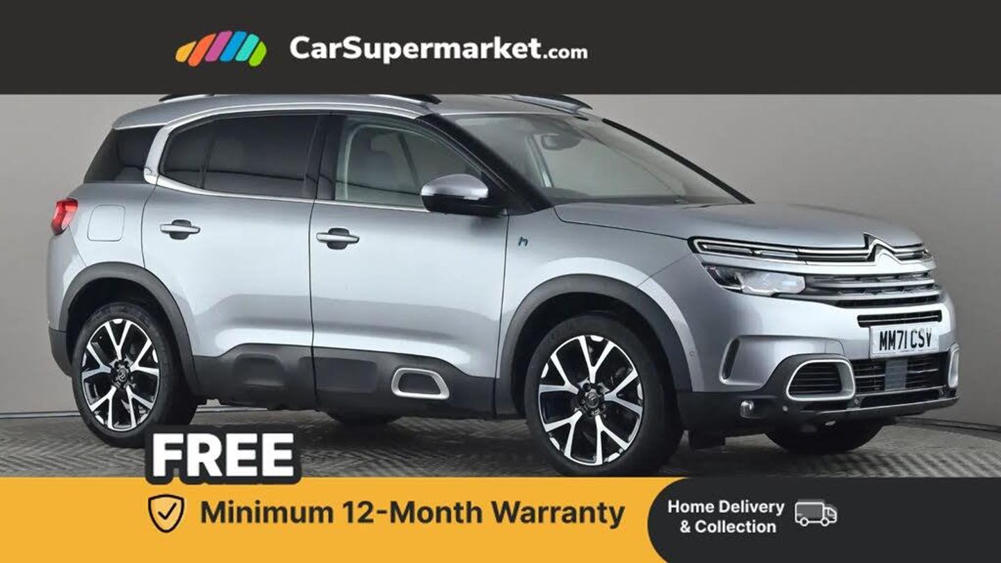 12.3" customisable TFT instrument display,Active cruise control with stop and go,Active lane departure warning system,Bluetooth telephone facility,Brake mode option on gear selector,Central 8" capacitive touch screen,Citroen connect box emergency assist system,Citroen connect Nav with connect box,Coffee Break Alert,Custom interface for instrument cluster and touchscreen,Driver attention alert system,Driving mode selector on central console,Eco+ mode,Electric power steering,Extended traffic sign recognition and recommendation,Exterior temperature indicator with ice warning,Highway driver assist,Mirror screen with Apple CarPlay and Android auto,Multi function trip computer,Programmable cabin pre-conditioning and deferred charging,Speed limit recognition and recommendation,Speed limiter,Top rear vision reversing camera,7.4 kW onboard charger,Mode 3 charging cable with type 2 connectors,Multi link rear suspension with Progressive Hydraulic Cushions,2 USB sockets,Auxiliary input socket,DAB (Digital Audio Broadcasting), AM/FM and MP3 compatible radio with two tweeters and four speakers,Voice recognition for radio, navigation and telephony features,3D effect LED rear lights,Acoustic laminated windscreen with rain and brightness sensors,Acoustically insulated drivers and passengers side windows,Airbump panels with colour insert on lower portion of the doors,Automatic hazard light activation upon heavy brake application,Automatic triggered rear windscreen wiper in reverse gear,Black upper and lower grille,Body colour door handles,C5 Aircross monogram on boot rear,Chrome exhaust trim,Citroen logo and monogram on rear,Dark tinted rear windows and rear windscreen,Electric, heated and folding door mirrors with integrated LED indicator and kerb puddle light,Frameless auto dimming electrochrome rear view mirror with blue LED electric driving mode indicator,Front fog lights with cornering function,Front windscreen wiper with magic wash cleaning system,Gloss black finish on A and B pillar and aerodynamic trim,Guide me home headlight function,Halogen rear fog lights,Halogen rear number plate lights,Headlights left on audible warning,Heated rear windscreen with integrated antenna,High level LED centre brake light,HYBRID badging to front wings and tailgate,Intelligent high beam headlights (auto dipping main beams),LED daytime running lights,LED front indicators,LED Headlights,Longitudinal roof bars,Matt black rear bumper fascia,Matt black side sill,Matte black lower rear skirt,Matte black wheel arch extensions,One touch electric front/rear windows with pinch protection,Painted front bumper,Painted rear bumper,Roof coloured rear spoiler with stainless edging trim,Satin chrome C signature,Satin chrome window surround,Twin exhaust effect trim,12V socket in boot,12V socket in cabin,2 Central illuminated cup holders,2 way lumbar adjustment for driver,2x Rear coat hooks,3 Independent full size rear seats with adjustable recline angle,3x Grab handles retractable with damping,Advanced comfort front and rear seats,Air recirculation when reverse gear is engaged,Aluminium pedals and foot rest,Anti odour and pollen filter,Central front armrest with butterfly wing opening and illuminated storage compartment,Dimmable white mood lighting,Dual zone automatic climate control,Fixing rings 4 in load compartment,Front and rear LED welcome/LED rear reading lights,Front door pockets store up to 1.5L bottle and A4 note pad,Front seat back map pockets,Gear lever in satin chrome,Height and reach adjustable leather steering wheel with 2 control zones and satin chrom inserts,Hinged rear parcel shelf,Isofix child seat preparation for front passenger seat,Leather effect dashboard fascia,Leather effect interior door handles,Manual passenger seat adjustment (height, fore/aft and backrest angle),Multi function leather steering wheel with two command blocks,Open central storage compartment,Open storage area next to gear selector,Rear door pockets store up to 75mm bottle,Rear passenger air vents,Satin chrome digital instrument panel and touchscreen trim,Satin chrome interior door handles,Seatbelt unfastened on the move audible and visual alert for front and rear seats,Smooth opening flocked glove box with lighting,Stainless steel front Citroen embossed sill scuff plates,Storage compartment for charging cable under boot floor,Safety plus pack with blind spot monitor - C5 Aircross,Visibility pack - C5 Aircross,2x Isofix child seat fitting on outer rear seats,3x Rear three point retractable seatbelts with pretensioners and force limiters in the outer rear seats,ABS/EBD,Adaptive driver and front passenger airbags with passenger airbag deactivation function,Collision risk alert,Driver and front passenger side airbags,DSC (Dynamic Stability Control) and ASR (Electronic Anti-skid System),Electric child locking functionality on rear windows and doors,Electronic parking brake,ESP including traction control and stability programme