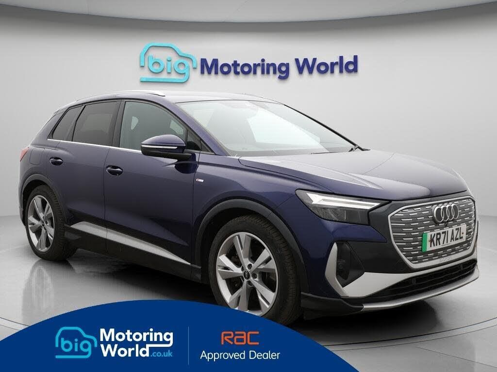 Part Leather Seats,Apple CarPl-Our Audi Q4 e-tron is finished in Blue. Specification includes a range of fantastic features including Part Leather Seats, Apple CarPlay, Lane Assist, S Line Body Styling, Android Auto, Privacy Glass, Heated Seats, Rear View Camera, Bluetooth, Audi Connect Specification information is supplied by CAPHPI and may vary to the actual car. This data does not form any part of a buying contact. Please check specification prior to purchase in-store. The MOT is valid until December 2026, visit bigmotoringworld.co.uk for more photos, a 360 tour, service history and a free HPI report.Were BIG on peace of mind and this Blue Audi Q4 e-tron has completed our comprehensive 200 point inspection and passed all checks. Its ready for you to drive away with immediate collection in-store. We include a 90-day warranty as standard plus an option to extend for up to 3 years.Reserve this car exclusively for you, safely and securely at bigmotoringworld.co.uk, with a fully refundable £99 deposit. Test drive before you buy, with no commitment, no hassle and a completely haggle free experience. Still searching and want to see thousands more cars? We are BIG on choice with over 8000 cars to choose from.Visit our award winning web site bigmotoringworld.co.uk.Were Big Motoring World and were BIG on what matters to you.