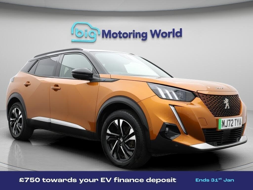 £750 towards your finance depo-Our Peugeot E-2008 is finished in Orange. Specification includes a range of fantastic features including £750 towards your finance deposit, Part Leather Seats, Apple CarPlay, Lane Assist, Visibility Pack, Android Auto, Satellite Navigation, Privacy Glass, Heated Seats, Rear View Camera Specification information is supplied by CAPHPI and may vary to the actual car. This data does not form any part of a buying contact. Please check specification prior to purchase in-store. The MOT is valid until October 2026, visit bigmotoringworld.co.uk for more photos, a 360 tour, service history and a free HPI report.Were BIG on peace of mind and this Orange Peugeot E-2008 has completed our comprehensive 200 point inspection and passed all checks. Its ready for you to drive away with immediate collection in-store. We include a 90-day warranty as standard plus an option to extend for up to 3 years.Reserve this car exclusively for you, safely and securely at bigmotoringworld.co.uk, with a fully refundable £99 deposit. Test drive before you buy, with no commitment, no hassle and a completely haggle free experience. Still searching and want to see thousands more cars? We are BIG on choice with over 8000 cars to choose from.Visit our award winning web site bigmotoringworld.co.uk.Were Big Motoring World and were BIG on what matters to you.