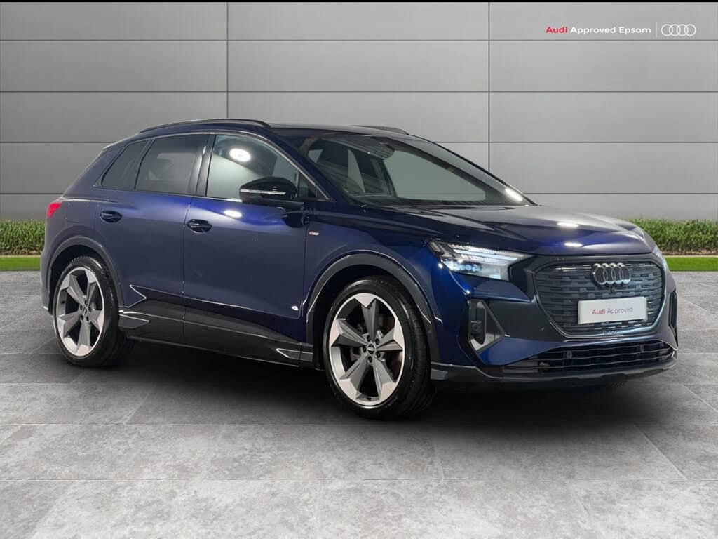 Adaptive cruise control with speed limiter, Audi connect safety and service (e-call), Audi drive select, Audi smartphone interface, Audi Virtual Cockpit - 10.25" display, Bluetooth interface, Camera based traffic sign recognition, Driver alert system, Lane departure warning system, MMI Navigation Plus with high resolution 11.6 inch touchscreen colour display, Power operated tailgate with sensor controlled release, Progressive steering, Rear view camera, Swerve assist and turn assist, 11KW onboard charger, 135kW DC charging capability, AC and DC charging access point positioned on the rear right, Compact e-tron charging system, Household plug type G (GB), Industry plug CEE 32 A/230 V/6 h/long + straight, Mode 3 type 2 AC charging cable 22kW, Sport suspension, 2 USB-C ports with charge and data functions, Audi sound system with 8 loudspeakers incl. centre speaker, subwoofer and 6-channel amplifier with total output of 180 watts, DAB Digital radio, Audi rings and model badging in black (with powertrain designation removed), Black roof rails, Contrast bumpers in Manhattan grey, Door mirror housings in black, Electrically adjustable/heated/folding/auto dimming door mirrors with integrated LED indications + kerb view function for passenger side, Frameless auto dimming interior rear view mirror, Heat insulating glass windscreen, Heated rear window, LED 3rd brake light, LED daytime running lights, LED Headlights, LED rear lights, Privacy glass - dark-tinted rear window, rear door windows and rear side windows, Projection light in the exterior mirrors, e-tron logo projected from the underside of the exterior mirror onto the ground, Rear side wing doors, Rear wiper, S Line badges on the front wings, S line exterior styling, Single frame grille with a structured, closed surface within an octagonal shape, 3 seat bench in 2nd row, 3 zone automatic air conditioning, 4 way electric lumbar support for driver and front passenger, 40/20/40 split folding rear seat bench, Accent surfaces in gloss black - centre console control panel, switch panel and trim on front doors in gloss black, Black cloth headlining, Comfort auxiliary air conditioning, Door armrests in leatherette, Driver/passenger manual seat height adjustment, Flat top and bottomed twin-spoke leather multifunction sport steering wheel with shift paddles for recuperation, Front door sill trims with aluminium inlay, illuminated with S logo, Front sport seats with integrated head restraints, Front/rear floor mats, Heated front seats, Pedals in stainless steel, Rear centre armrest with cupholders, Rear head restraints, Single front passenger seat, Ambient lighting plus pack - Q4 E-tron, Black styling pack plus - Q4 E-tron, Non smoking pack - Q4 E-tron, 3x3 point rear seatbelts, Acoustic vehicle alerting system, Convenience key with safelock, Driver and front passenger airbag with passenger airbag deactivation, Electric child locks, First aid kit with warning triangle and vests, Front side airbags with head airbag system and front interaction airbag, i - Size child seat mounting on the front passenger side and i - Size and top tether on the outer rear seats, Pre-sense front with pedestrian and cyclist detection, Seat belt monitoring, Tyre pressure loss indicator, Anti theft alarm, Anti-theft wheel bolts, Keyless Go, Aluminium look interior elements, 21" 5 arm rotor evo Audi Sport alloy wheels in matt grey, gloss turned finish and tyre seal technology, Vehicle tool kit