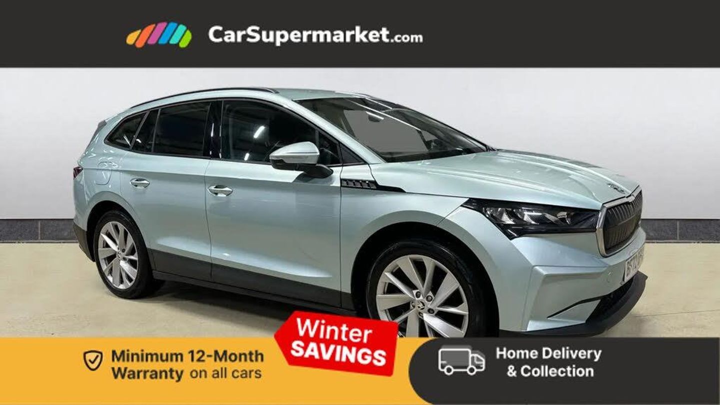 13" touchscreen display,Bluetooth system,E-call,Electronic engine sound,Exterior temperature indicator,Gesture control,Power assist steering,Rear parking sensors,Satellite navigation system,Skoda Connect iV remote services with charging, air conditioning and smart schedules,Smartlink wireless for apple carplay and wired for android auto,Speed limiter,Tailgate unlocking from outside,Virtual cockpit,Voice control system,Washer fluid level indicator,Wi-Fi hotspot,120 kW DC charging,6m mode 3 cable (32A),8 Speakers,DAB Digital radio,USB-C ports (charging + data),Auto dimming rear view mirror,Black roof rails,Body colour bumpers,Body colour door mirrors and handles,Door moulding light in multiple colours,Electric adjustable heated folding door mirrors with boarding spots and welcome logo,Electric front and rear windows,Heat insulating darkened glass in side and rear windows,Heat insulating glass in windshield,Heated rear window,LED third brake light,Light assistant (coming home/tunnel light),Radiator grille frame in matt black with chrome strip,Rain and light sensors,Rear side wing doors,Rear spoiler,Rear window wiper with washer system and intermittent control,Safety reflectors on front and rear doors,Variable front intermittent wipers,12V socket in boot,3 rear headrests,3 seat bench in 2nd row,4 foldable roof handles with rear coat hooks,60:40 foldable rear seat with sliding adjustment and backrest angle adjustment,Boot lighting,Coat hooks on B pillar,Front and rear footwell lighting,Front and rear height adjustable headrests,Front courtesy lights,Front reading lights,Height adjustable front passenger seat,High centre console,Illuminated and cooled glovebox,Interior door handle lighting in front and rear,Isofix child seat fittings in outer rear seats with top tether,Isofix child seat preparation for front passenger seat,Laminated soft-touch plastic knee rest,LED ambient lighting,Manual lumbar support for front passenger seat,Manually adjustable steering column,Pollen filter,Rear reading lights,Single front passenger seat,Sliding boot cover,Sunvisors with illuminated vanity mirrors,Umbrella in door panel,ECO Suite design pack - Enyaq,3 point height adj front seatbelts + pretensioners,Auto door release and activation of warning lights in the event of an accident,Central interaction airbag,Driver and front passenger airbags,ESC (incl. ABS+MSR+ASR+EDS+HBA+DSR+RBS+MKB),Front and rear three point safety belt on all seats,Front assist with assisted automatic braking,Front disc brakes,Front passenger airbag deactivation switch,Front side airbags with curtain airbags,Rear drum brakes,Single tone horn,Tyre pressure monitor,Visual and acoustic seat belt reminder,Warning lights in front doors,Anti theft alarm system with interior monitoring, backup horn and towing protection,Remote central locking with SAFE system,Anti-theft wheel bolts protection,Tyre repair kit with compressor