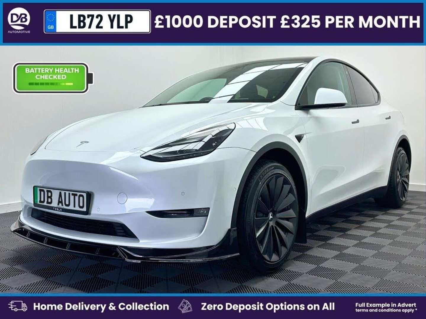 WP72 VWY | Aero Kit | Heat Pump | Excellent Battery Report | Battery Warranty until 2030 or 120,000 miles. Non Battery Warranty Available This Tesla Model Y presents a superb ownership opportunity, having been cherished by only one owner since new. As a fully electric vehicle, it offers a substantial maximum range of 283 miles on a full charge, making it ideal for both daily commutes and longer journeys. The Model Y is renowned for its practicality, boasting a large boot space that provides ample room for luggage, shopping, or sporting equipment. Experience impressive performance with the Model Y's swift acceleration, capable of reaching 60 miles per hour in just 6.6 seconds. This responsiveness, combined with its electric powertrain and generous range, positions the Model Y as a compelling choice for those seeking an efficient and dynamic driving experience. Its single owner history further enhances its appeal, suggesting careful maintenance and a well looked after vehicle. All our cars come with a minimum 9 months service and for further peace of mind DB Automotive offer a 2 Year PWarranty. Please contact the DB Team on 0113 4871111 A £595 arrangement fee is charged for using lenders outside of our finance panel. There is no charge for using your own funds. The vehicle data displayed highlights the typical specification of the most recent model of this vehicle. This specification is sourced from leading industry suppliers CAP/HPI. We offer this information in good faith however cannot guarantee the accuracy of any specification/information supplied by 3rd party providers. The specification can vary. You must physically check the specification of the vehicle on site prior to purchase. The specification & features on this website do not form part of the buying contract. *All offers are subject to change at any time due to market and availabile