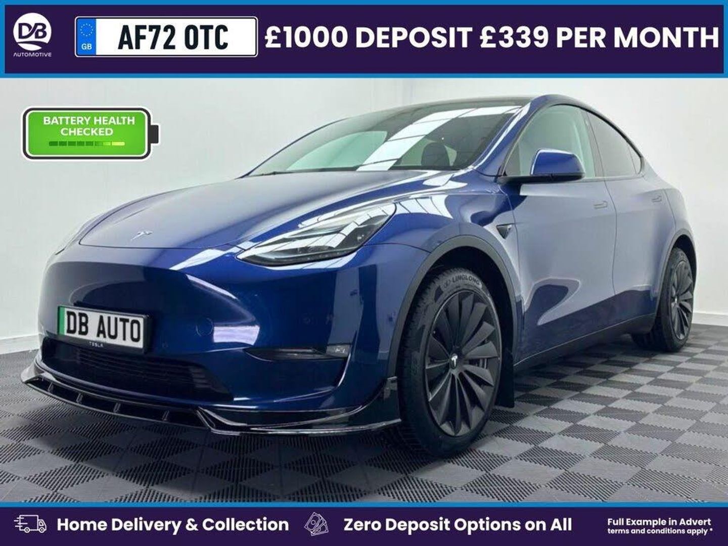 AMD Ryzen | Long Warranty (up to 120k or 8 years) Aero Kit - Including Front Splitter | Rear Spoiler | Battery Health | Miles 50750 Interior Styling - Alcantara interior to replace the Wood effect. Optional Upgrades - Wheel Caliper Painting This 2022 Tesla Model Y Long Range offers an exceptional electric driving experience with its impressive 331 mile maximum range. As an electric vehicle, it boasts a Four Wheel Drive drivetrain powered by an 85 kWh battery. Charging at home using a 7kW charger will take approximately 12 hours for a full charge, while rapid public charging can take you from empty to 80% in as little as 25 minutes. The Model Y Long Range stands out with its remarkable acceleration, achieving 0 to 60 miles per hour in just 4.8 seconds, demonstrating its dynamic performance. This variant also features a large boot space, providing ample room for luggage and shopping. These highlights indicate that this Tesla Model Y offers superior performance and practicality compared to many other vehicles in its class. All our cars come with a minimum 9 months service and for further peace of mind DB Automotive offer a 2 Year PWarranty. Please contact the DB Team on 0113 4871111 A £595 arrangement fee is charged for using lenders outside of our finance panel. There is no charge for using your own funds. The vehicle data displayed highlights the typical specification of the most recent model of this vehicle. This specification is sourced from leading industry suppliers CAP/HPI. We offer this information in good faith however cannot guarantee the accuracy of any specification/information supplied by 3rd party providers. The specification can vary. You must physically check the specification of the vehicle on site prior to purchase. The specification & features on this website do not form part of the buying contract. *All offers are subject to change at any time due to market and availabile