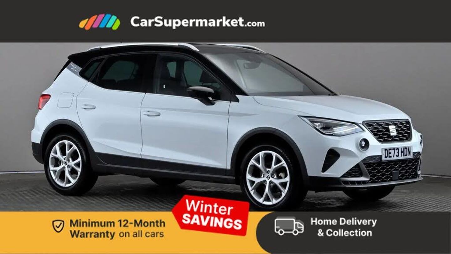 'Lights On' Reminder warning buzzer,8" Digital cockpit,Digital clock,E-call,Electric speed sensitive power steering,Full Link Smartphone Integration with Mirror Link, Apple Car Play, Google Android Auto with USB Type C cable for Apple and Android compatibility,Lane keeping system,Low fuel warning light,Outside temperature display,Rear parking sensor,RPM counter,Seat connect with safety, service, remote and online,SEAT Drive profile - Four different models normal-sport-eco-individual, steering response, throttle response,Trip computer,Wireless phone charger,9.2" colour touchscreen with navigation system, voice control and USB port (type c),Bluetooth interface for hands free and audio streaming,DAB digital radio and AM/FM radio,Steering wheel mounted audio controls,Anti theft roof antenna,Auto dimming interior rear view mirror,Automatic activation of hazard warning lights,Body coloured bumpers,Body coloured door handle inserts,Chrome roof rails and window surrounds,Dark tinted rear windows,Electric front/rear windows,Electrically adjustable, heated and folding door mirrors,Front fog lights with cornering function and rear fog light,FULL LED automatic headlights with dynamic headlight range control, coming and leaving home, LED daytime running lights,LED rear tail lights and licence plate lights,Protective side mouldings,Rain sensing wipers,Rear side wing doors,Rear spoiler,Rear window wash/wipe,Roof colour door mirrors,Third brake light,Twin exhaust pipe styling hidden exhaust pipe,Visible VIN plate,Windshield wiper with intermittent control and potentiometer,2 cupholders,3 seat bench in 2nd row,60/40 split folding rear seat,Aircare filter,Black interior roof,Cloth upholstery,Double boot floor,Driver sunvisor with covered mirror + card holder,Dual zone climate control,Front courtesy light with front reading lights,Front sport seats,Gear shift indicator,Height adjustable front seats,Height/reach adjustable steering column,Illuminated boot,Instrument lighting with brightness control,Interior ambient lighting,Interior light in footwell, central console and door panel,ISOFIX points in outer rear seats with top tether anchorage points,Passenger sunvisor with vanity mirror,Perforated flat bottomed leather steering wheel/gear knob/handbrake with red stitching and FR logo,Single front passenger seat,Two front and three rear height adjustable headrests,Interior chrome pack - Arona,3 point seatbelts on all rear seats,ABS,Active front headrests,Child locks on rear doors,Driver and front passenger airbags with front passenger airbag de activation, front side and curtain airbags,Electronic stability control,Emergency Brake Assist (EBA) and front assist,Front and rear seatbelt reminder,Hill hold control,Multi-Collision braking,Tiredness recognition system,Traction control,Tyre pressure monitoring system,Alarm with back-up horn,Electronic engine immobiliser,Locking wheel bolts,Remote central locking + deadlocks,Tow away protection,Titan black dashboard,17" Dynamic alloy wheels