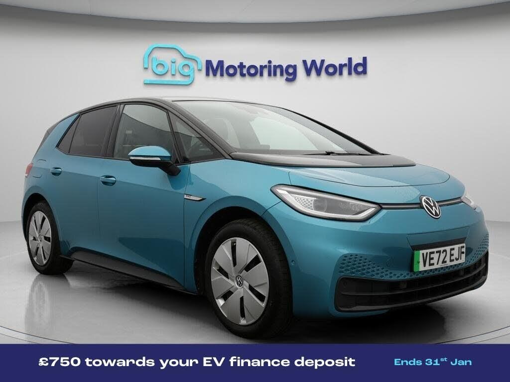 £750 towards your finance depo-Our Volkswagen ID.3 comes with optional extras worth £665. Specification includes a range of fantastic features including £750 towards your finance deposit, Adaptive Cruise Control, Lane Assist, Privacy Glass, Gesture Control, Rear View Camera, Internet, Bluetooth, Blind Spot Assist, Parking Sensors Specification information is supplied by CAPHPI and may vary to the actual car. This data does not form any part of a buying contact. Please check specification prior to purchase in-store. The MOT is valid until December 2026, visit bigmotoringworld.co.uk for more photos, a 360 tour, service history and a free HPI report.Were BIG on peace of mind and this Turquoise Volkswagen ID.3 has completed our comprehensive 200 point inspection and passed all checks. Its ready for you to drive away with immediate collection in-store. We include a 90-day warranty as standard plus an option to extend for up to 3 years.Reserve this car exclusively for you, safely and securely at bigmotoringworld.co.uk, with a fully refundable £99 deposit. Test drive before you buy, with no commitment, no hassle and a completely haggle free experience. Still searching and want to see thousands more cars? We are BIG on choice with over 8000 cars to choose from.Visit our award winning web site bigmotoringworld.co.uk.Were Big Motoring World and were BIG on what matters to you.