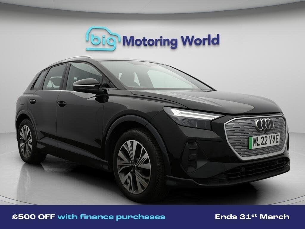 £500 towards your finance depo-Our Audi Q4 e-tron is finished in Black. Specification includes a range of fantastic features including £500 towards your finance deposit, 19'' Alloy wheels, Lane Assist, Satellite Navigation, Heated Seats, Rear View Camera, Bluetooth, Audi Connect, 2 Zone Climate, Cruise Control Specification information is supplied by CAPHPI and may vary to the actual car. This data does not form any part of a buying contact. Please check specification prior to purchase in-store. The MOT is valid until January 2027, visit bigmotoringworld.co.uk for more photos, a 360 tour, service history and a free HPI report.Were BIG on peace of mind and this Black Audi Q4 e-tron has completed our comprehensive 200 point inspection and passed all checks. Its ready for you to drive away with immediate collection in-store. We include a 90-day warranty as standard plus an option to extend for up to 3 years.Reserve this car exclusively for you, safely and securely at bigmotoringworld.co.uk, with a fully refundable £99 deposit. Test drive before you buy, with no commitment, no hassle and a completely haggle free experience. Still searching and want to see thousands more cars? We are BIG on choice with over 8000 cars to choose from.Visit our award winning web site bigmotoringworld.co.uk.Were Big Motoring World and were BIG on what matters to you.