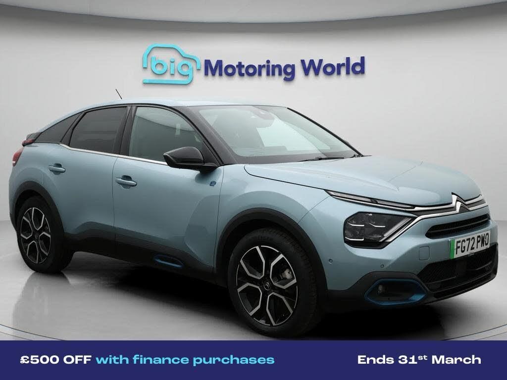 £500 towards your finance depo-Our Citroen e-C4 is finished in Blue. Specification includes a range of fantastic features including £500 towards your finance deposit, Head up Display, 18'' alloy wheels, Leather Seats, Satellite Navigation, Privacy Glass, Heated Seats, Rear View Camera, Heated Steering Wheel, Bluetooth Specification information is supplied by CAPHPI and may vary to the actual car. This data does not form any part of a buying contact. Please check specification prior to purchase in-store. The MOT is valid until September 2026, visit bigmotoringworld.co.uk for more photos, a 360 tour, service history and a free HPI report.Were BIG on peace of mind and this Blue Citroen e-C4 has completed our comprehensive 200 point inspection and passed all checks. Its ready for you to drive away with immediate collection in-store. We include a 90-day warranty as standard plus an option to extend for up to 3 years.Reserve this car exclusively for you, safely and securely at bigmotoringworld.co.uk, with a fully refundable £99 deposit. Test drive before you buy, with no commitment, no hassle and a completely haggle free experience. Still searching and want to see thousands more cars? We are BIG on choice with over 8000 cars to choose from.Visit our award winning web site bigmotoringworld.co.uk.Were Big Motoring World and were BIG on what matters to you.