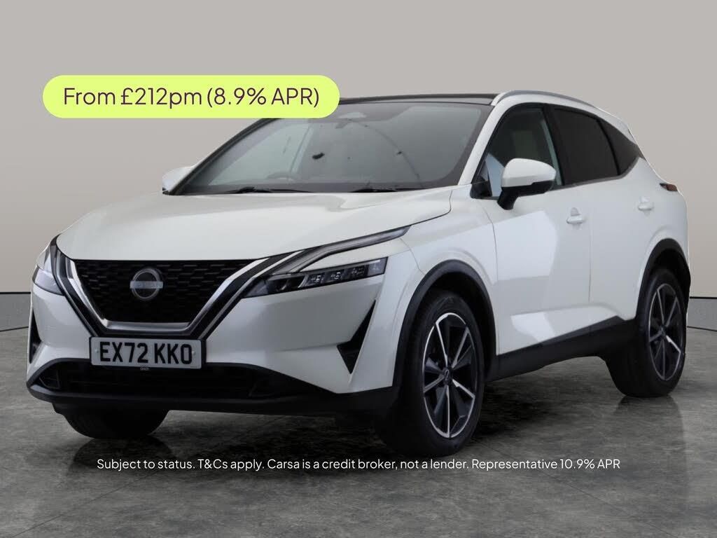 Experience the Nissan Qashqai at its finest, featuring a stunning glass roof pack that floods the stylish interior with light. Stay connected and entertained with Apple CarPlay and an advanced Sat Nav, while the surround view and 360-degree camera make parking a breeze. Enjoy extra comfort with heated seats and a heated steering wheel, and drive with peace of mind thanks to intelligent safety features like Blind Spot Assist and Lane Departure Warning. Sharp LED headlights complete the modern look of this white SUV. 1 service recorded, last serviced on 24/10/2025 at 55,100 miles. MOT to 19/08/2026. Visit our website for service history, online valuation, full vehicle specification plus multiple images. Any feature/option specified here is from 3rd party data. We cannot guarantee the accuracy of any specification supplied by a 3rd party. We recommend that you physically check the specification of the vehicle on site prior to purchase. This information does not form part of the buying contract. Terms & Conditions apply. We have over 2,000 cars available from our 10 national branches, check our website to see all our stock. Our Trustpilot rating is 4.4/5 with over 9,000 reviews.