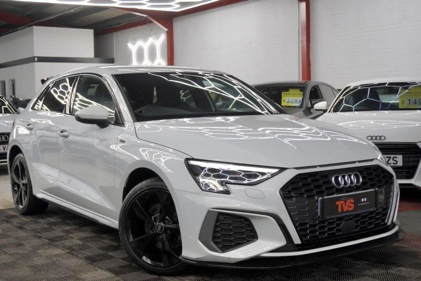 Twin Leather - Front Sport Seats with S Embossed Logo - Black, 18in Alloy Wheels - 5-spoke V Style Diamond Cut, Ibis White, 12v Socket and Storage Compartment in Front Centre Console, 18in Alloy Wheels - 5-Arm Dynamic Design, 2 USB-C Ports with Charge and Data Functions, 3.6kW Onboard Charger, 6 Passive Loudspeakers, Airbags - Driver and Front Passenger with Passenger Airbag Deactivation, Aluminium Interior Elements, Aluminium Window Trims, Anti Theft Locking Wheel Bolts, Anti-Theft Alarm, Audi Connect Emergency Call and Service, Audi Connect Navigation and Infotainment Services Plus (3 Year Subscription From New), Audi Drive Select, Audi Pre-Sense Front with Pedestrian and Cyclist Recognition, Audi Smartphone Interface, Audi Virtual Cockpit, Auto Dimming and Frameless Rear View Mirror, Automatic Start-Stop System with Recuperation, Bluetooth Interface, Body Coloured Door Mirrors, Child Locks - Manual, Cloth Headlining in Black, Collision Avoidance Assistant, Cruise Control, DAB Digital Radio, Domestic Charging Cable - 3 Pin 10 Amp, Dual-Zone Electronic Climate Control, ESC - Electronic Stabilisation Control inc ABS - ASR and EDL, Electric Windows - Front, Electromechanical Power Steering, Electronically Operated Child Locks, Exterior Mirrors - Electrically Adjustable - Heated and Folding - Automatically Dimming on Both Sides with Built-In LED Side Indicators - Including Automatic Kerb-Side Function for the Passenger-Side, First Aid Kit and Warning Triangle and 2 Safety Vests, Front Side Airbags with Head Airbags and Interaction Airbag, Front Sports Seats, Front and Rear Centre Armrest in Leather, Front and Rear Floor Mats, Hill Hold Assist, I-Size and Top Tether Child Seat Mounting for the Outer Rear Seats, Illuminated Door Sill Trims with Aluminium Inserts and S Logo, Illuminated Vanity Mirrors, Inlays - Dark Spectrum Aluminium, LED Headlights with LED Rear Lights and Dynamic Rear Indicators, Lane Departure Warning, Light and Rain Sensor, Luggage Compartment Floor Covering, MMI Navigation Plus with High Resolution 10.1in Touchscreen Colour Display, Manual Boot Compartment Lid, Pedals in Stainless Steel and Footrest in Black, Privacy Glass, Privacy Glass - Dark-Tinted Rear Window - Rear Door and Side Window., Rear Parking Sensors, Rear Side Air Outlets - Grained Matt Black, Remote Central Locking, S Line Bumpers, S Line Styling, S Roof Spoiler, Seat Belt Monitoring, Split-Folding Rear Seat Bench can be Split 40: 20: 40 or Fully, with Centre Armrest and Cup Holders, Standard Suspension, Steering Wheel - 3-Spoke Leather-Multi-Function, Tool Kit, Type 2 Mode 3 32amp Charging Cable, Type 2 Socket for AC Charging, Tyre Pressure Loss Indicator, Tyre Repair Kit, Voice Control System with Natural Language Interaction, Windscreen with Acoustic Glazing