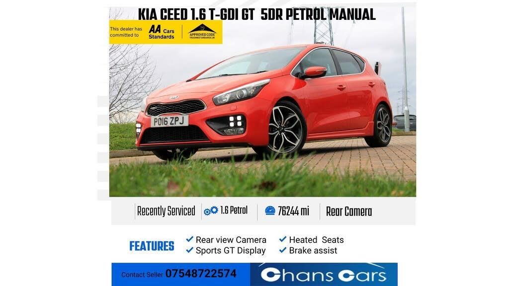 This 2016 Kia Ceed T GDi GT is a well maintained example of this popular model. It features a responsive 1.6 litre petrol engine and meets Euro 6 emission standards. Inside, you'll find comfortable heated front seats, a smart key entry system for effortless access, and dual automatic air conditioning with an ioniser to keep the cabin pleasant. For convenience and safety, it also includes xenon headlights with auto levelling and a reversing camera system to assist with parking. Service history ,76244 Miles, MOT Until -28/01/2027. Phone Bluetooth, Cruise Control, Power Steering, Isofix, Radio with CD and MP3, Rear Parking Sensors And camera, Heated Seats and Heated SteeringThe Kia Ceed GT offers an engaging driving experience, highlighted by its brisk acceleration from 0 to 60 miles per hour in just 7.3 seconds. This performance, combined with its generous boot space, makes it a practical choice for everyday use and longer journeys. These attributes, along with its comprehensive feature set, position this Ceed GT as a compelling option when compared to other vehicles in its class.-Reversing camera-FREE 12 Months AA Break Down Cover (T&C App)