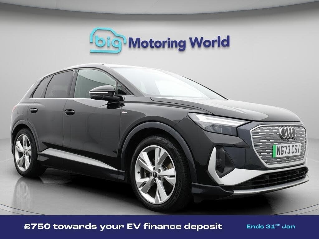 £750 towards your finance depo-Our Audi Q4 e-tron is finished in Black. Specification includes a range of fantastic features including £750 towards your finance deposit, Leather Seats, Lane Assist, S Line Body Styling, Privacy Glass, Heated Seats, Rear View Camera, Bluetooth, Audi Connect, 2 Zone Climate Specification information is supplied by CAPHPI and may vary to the actual car. This data does not form any part of a buying contact. Please check specification prior to purchase in-store. The MOT is valid until November 2026, visit bigmotoringworld.co.uk for more photos, a 360 tour, service history and a free HPI report.Were BIG on peace of mind and this Black Audi Q4 e-tron has completed our comprehensive 200 point inspection and passed all checks. Its ready for you to drive away with immediate collection in-store. We include a 90-day warranty as standard plus an option to extend for up to 3 years.Reserve this car exclusively for you, safely and securely at bigmotoringworld.co.uk, with a fully refundable £99 deposit. Test drive before you buy, with no commitment, no hassle and a completely haggle free experience. Still searching and want to see thousands more cars? We are BIG on choice with over 8000 cars to choose from.Visit our award winning web site bigmotoringworld.co.uk.Were Big Motoring World and were BIG on what matters to you.