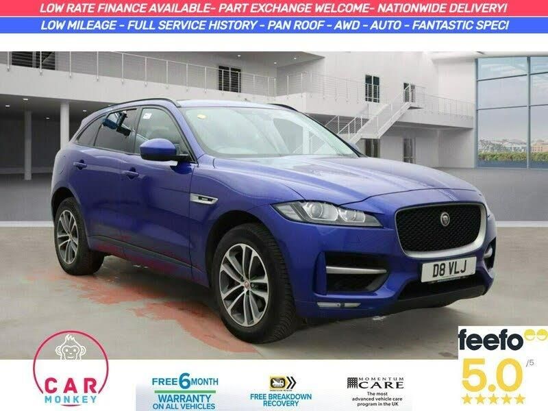 This 2018 Jaguar F-PACE P250i R-Sport boasts an exceptionally low mileage for its age, having covered just 46,470 miles. This premium SUV features a powerful 2.0 litre petrol engine paired with a responsive Four Wheel Drive system, ensuring confident performance in all conditions. It meets Euro 6 emissions standards and comes with a clear vehicle history check and a comprehensive 6 month warranty for your peace of mind. The full service history further underlines its excellent provenance.The R-Sport trim level enhances the F-PACE's already striking presence, complemented by stylish 20 inch alloy wheels with a gloss black finish. Practicality is also a key consideration, with a generous boot space perfect for luggage or shopping, and an electrically deployable tow bar capable of towing up to 2400 kg. Enjoy an open and airy cabin thanks to the fixed panoramic roof, which includes a panoramic sunroof. Auto dimming, power folding, and heated door mirrors with approach lights add to the sophisticated feel. Experience exhilarating acceleration, reaching 0-60mph in a swift 6.4 seconds, demonstrating its superior performance compared to other vehicles in its class. A 12 month MOT will be provided upon purchase, ensuring its roadworthiness.This car will come supplied with MOT, Service and a comprehensive warranty included! Low rate finance available, Best prices given for part exchanges and nationwide delivery available! Call us to reserve today!