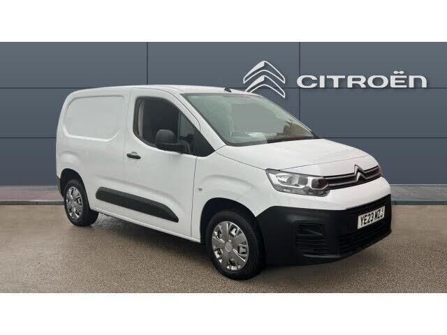 This 2023 Citroen Berlingo M (Medium) 1.5 BlueHDi 1000kg Enterprise Edition in white is a front-wheel-drive compact panel van with a 100hp (102hp/75kW) diesel engine, 6-speed manual gearbox, and Stop & Start (S/S) technology. Key specs include a 1,000kg payload, approx. 3.3-3.9 /(m {3}/) load volume, air conditioning, rear parking sensors, 8-inch touchscreen with Apple CarPlay/Android Auto, and a 3-seat cabin.